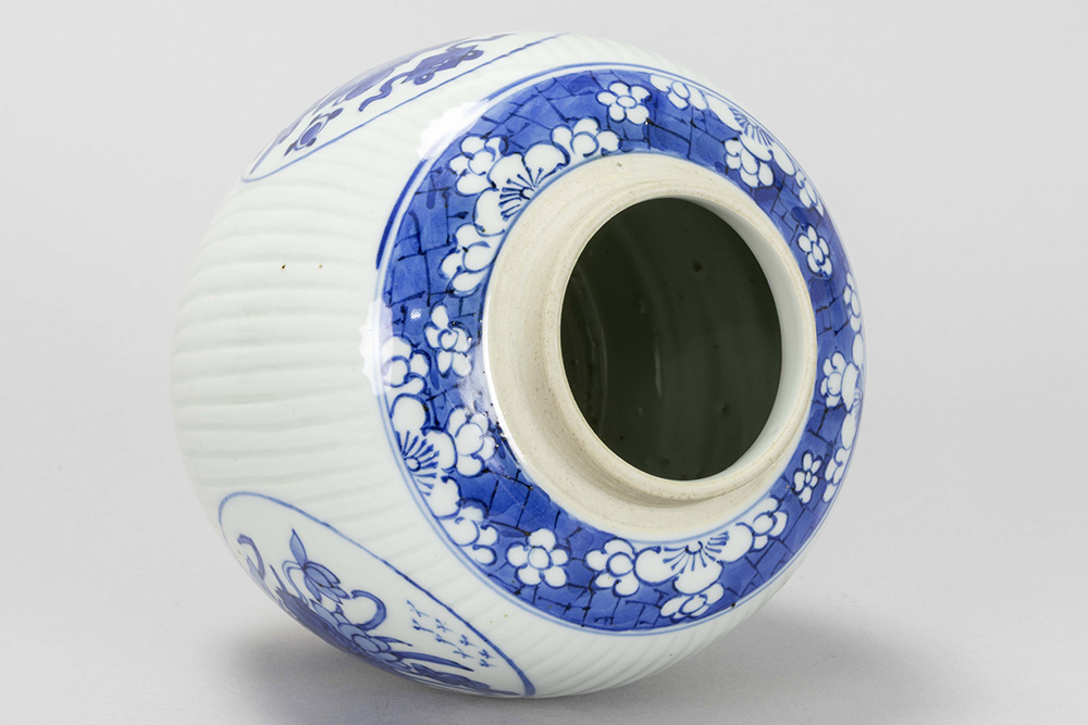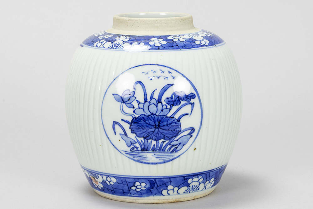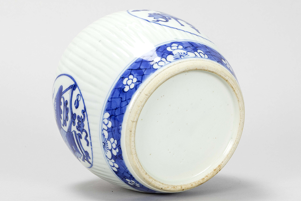 antique Chinese gingerpot with a ribbed surface in porcelain with a blue-white decor