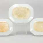 Set (3) van een grotere en twee kleinere achttiende eeuwse Chinese opdienschalen in porselein met een floraal blauwwit decor – 33 x 25,5 en 29 x 22 cm