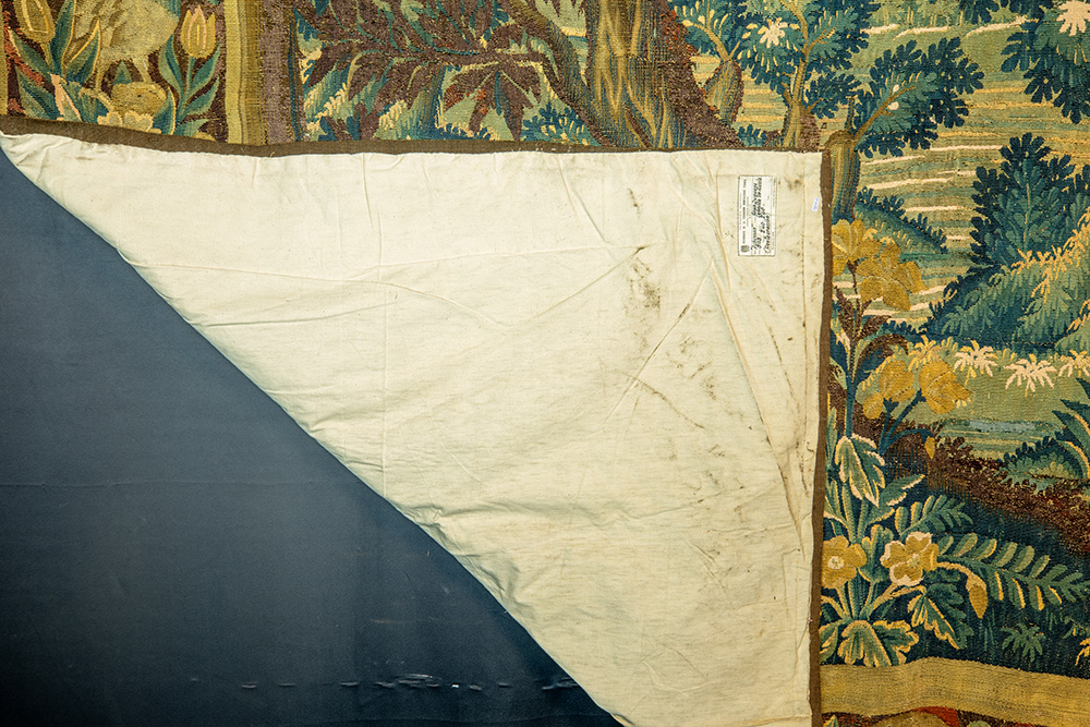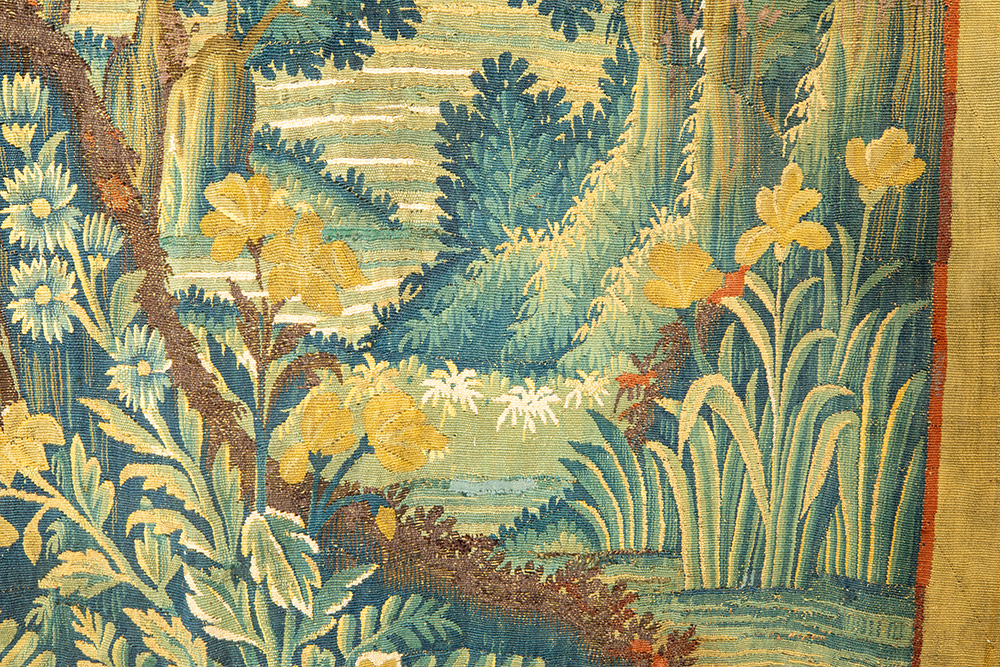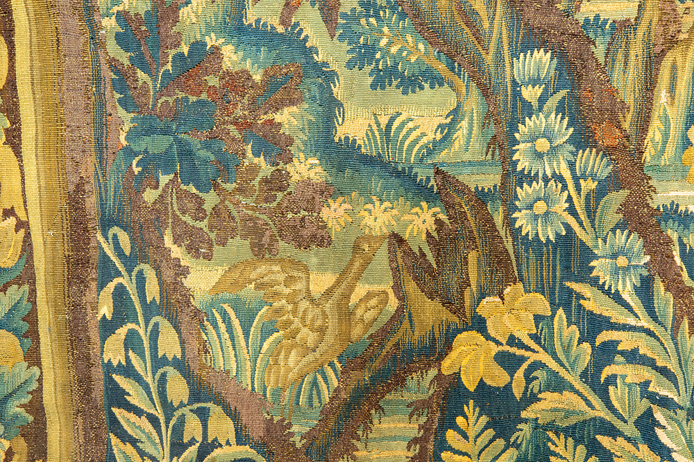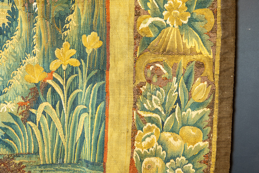 Zeventiende/achttiende eeuws Aubusson – wandtapijt met een verdurethema met rivierlandschap met dorpszicht en met een boord oa met vogels – 240 x 240 cm met op verso een etiket van de “Patronato de la Fundacion Generalisimo” die de herkomst legt bij Groothertogin Léonida de Russie, geboren Léonida Guéorguievna Bagration-Moukhranskaïa (Tbilissi 1914 – Madrid 2010).