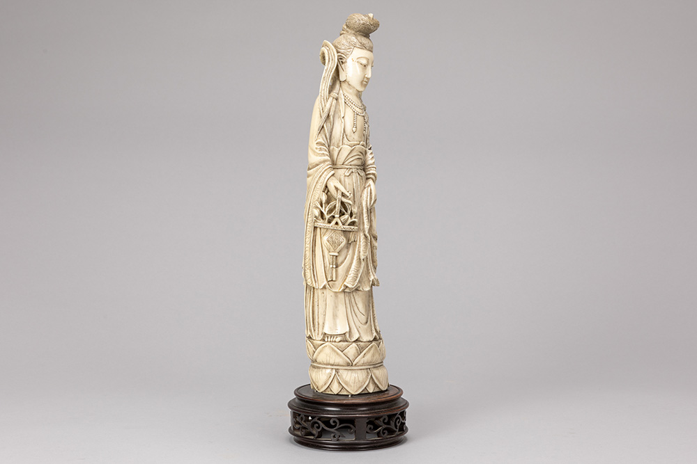 Antieke Chinese boeddhistische sculptuur uit de Qing-periode in ivoor : “Quan Yin staand op een dubbele lotusbloemsokkel (” Visma-Padmasana” genoemd)” – hoogte : 38,5 cm – op sokkel – gewicht : 1853 gram – ca 1880/1900