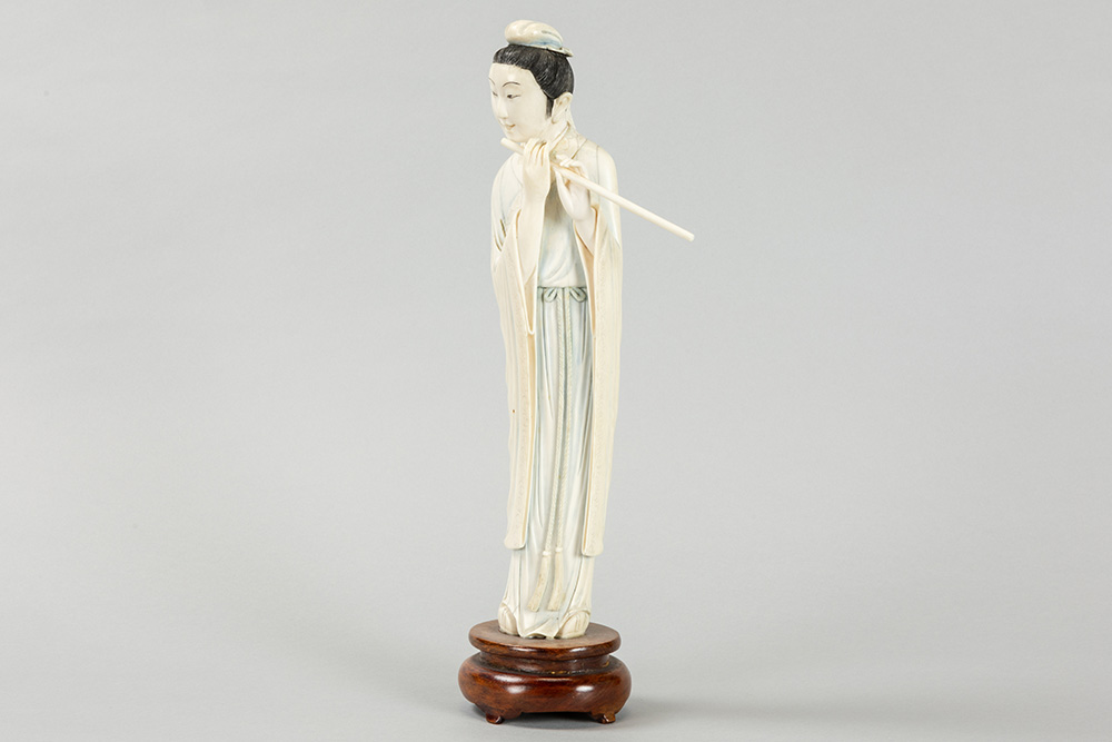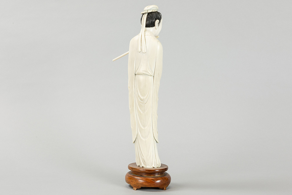 ‘Antieke’ Chinese sculptuur uit de late Qing/ vroege Republiekperiode in ivoor : “Fluitspelende man” – hoogte : 30 cm – ca 1910/20