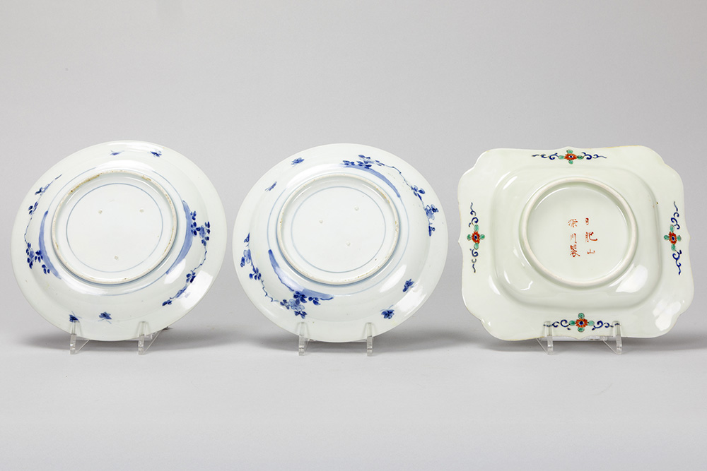 Lot (3) antiek Japanse porselein met een paar borden met Imari-decor en een gemerkt schaaltje met polychroom decor