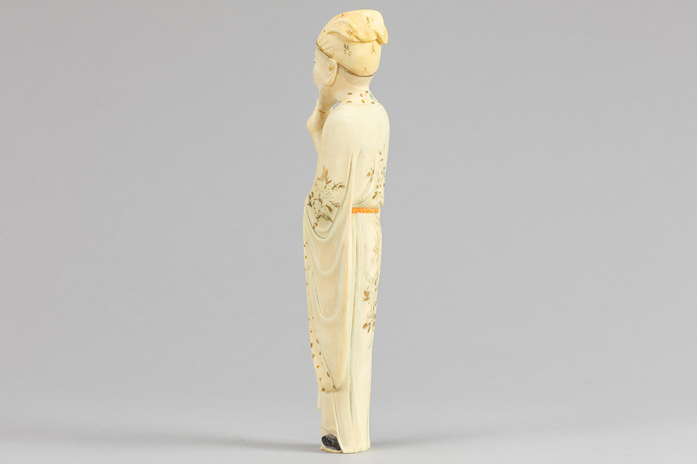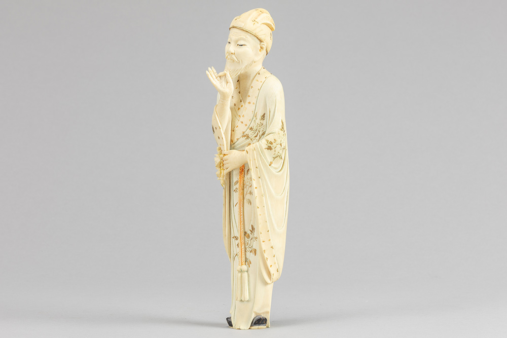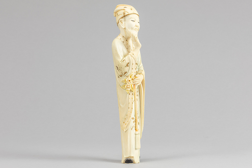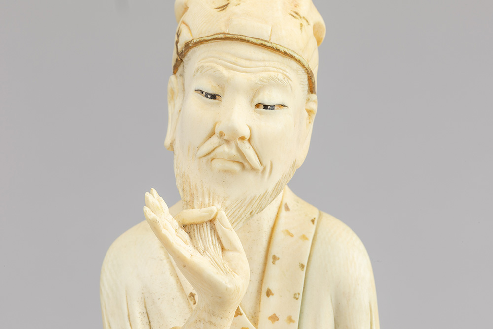 19th Cent. Chinese Qing period sculpture in ivory with quite well preserved polychromy and gilding depicting a pensive man with hand in beard