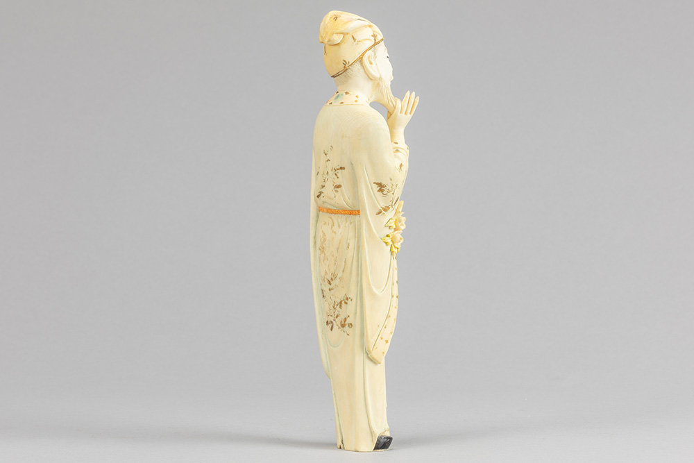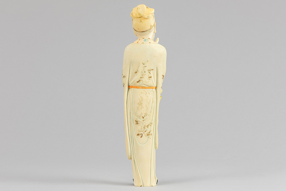 Antieke Chinese sculptuur in ivoor met vrij goed bewaarde polychromie en dorure : “Peinzende man met hand in de baard” – hoogte : 23,5 cm – gewicht : 380 gram – 19° eeuw of vroeger