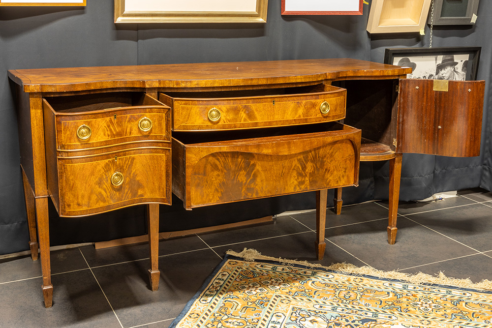 Antieke Engelse “dresser” in acajou met orgelgebogen front met deur en drie laden – 92 x 180 x 68 cm