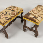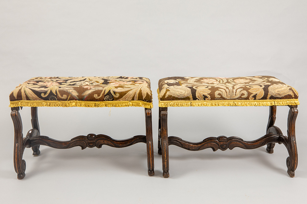 Paar zeventiende/achttiende eeuwse Louis XIV-voetbankjes met onderstel in notelaar met typische vorm en kruisverbinding – met petit pointbekledin