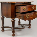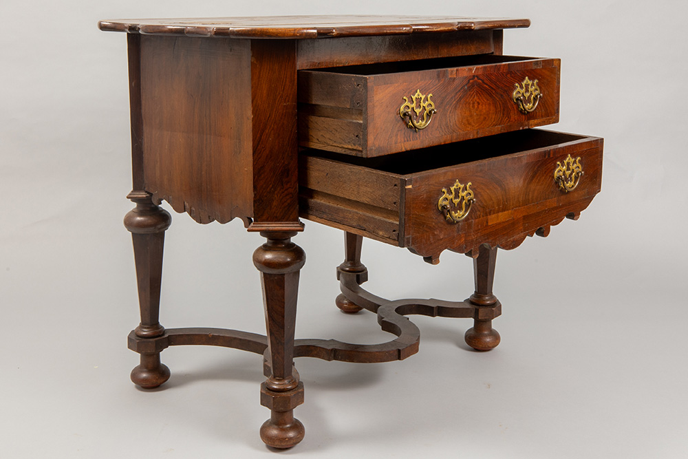 Zeventiende eeuws barok bijzetmeubeltje in wortelhout, eik en notelaar met twee laden en met verbonden balusterpoten met kruisverbinding – 78 x 87 x 61 cm