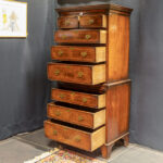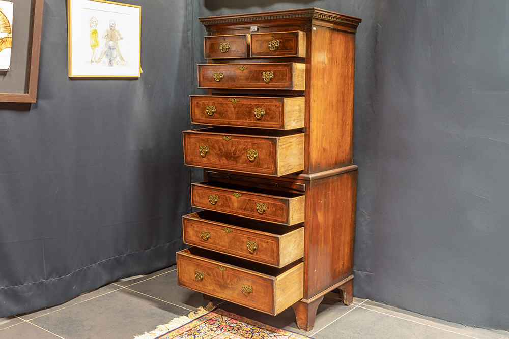 Kleine antieke Engelse zgn ‘Tall Boy’ (of ‘Bachelor’s chest-on-chest) in notelaar en wortelhout met acht laden en een uittrekbare werkplank – 153 x 71 x 48 cm