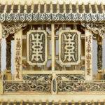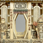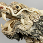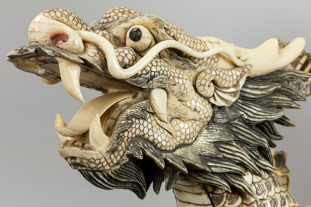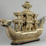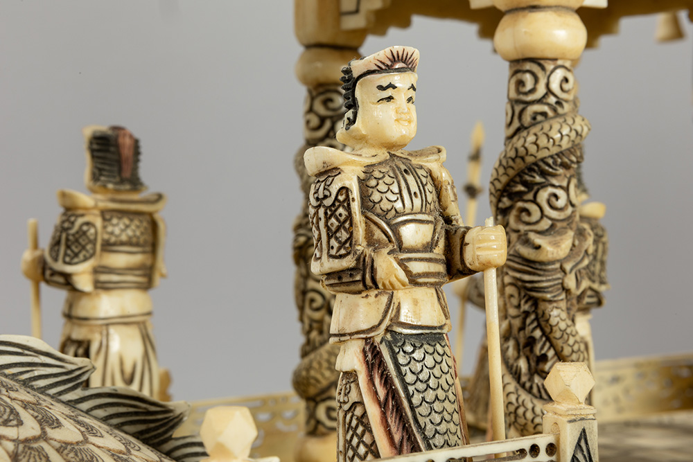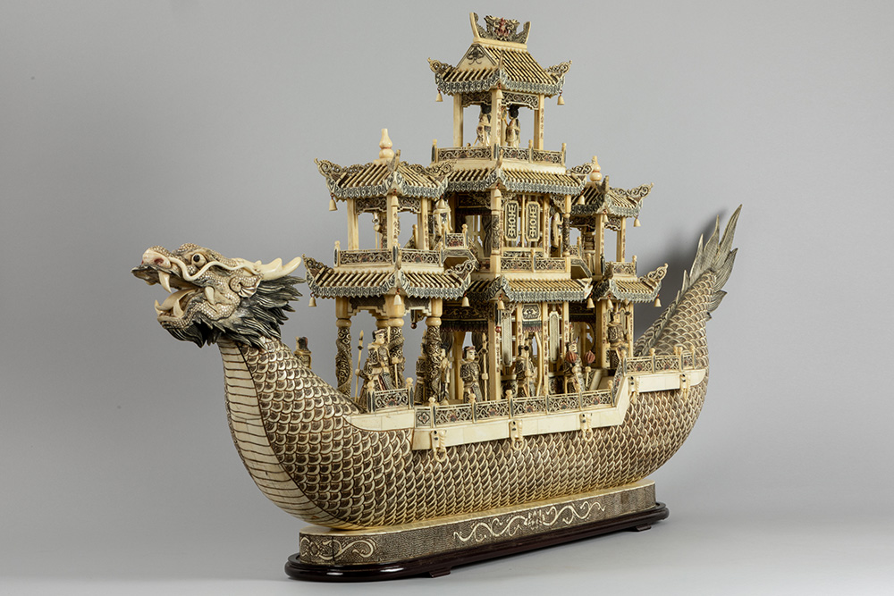 quite big Chinese vintage bone dragon’s boat with figures and pagodas