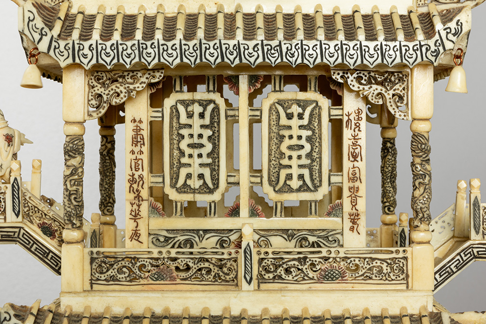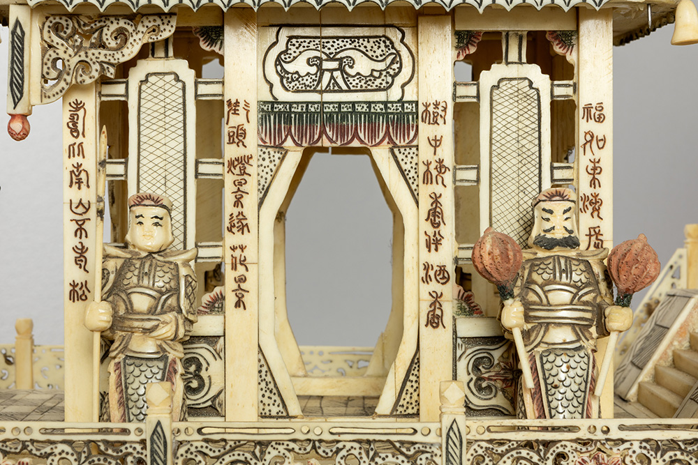 Vrij grote Chinese vintage drakenboot met figuren en pagodes in been – hoogte en breedte : 65 x 138 cm – ca 1980/90