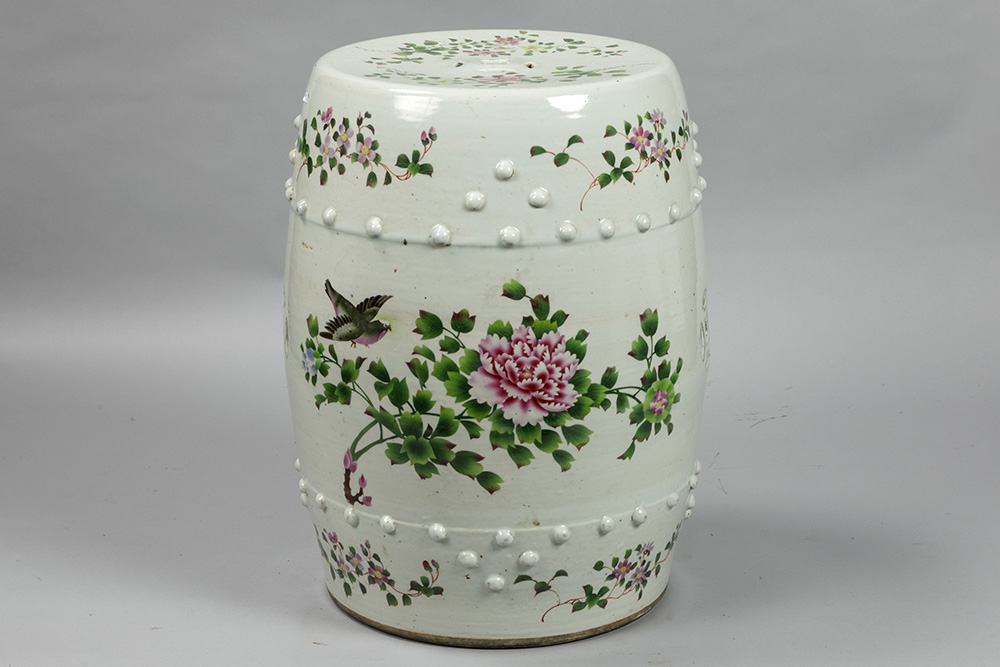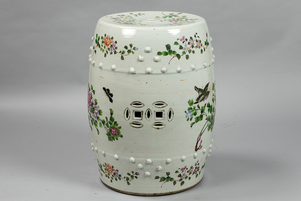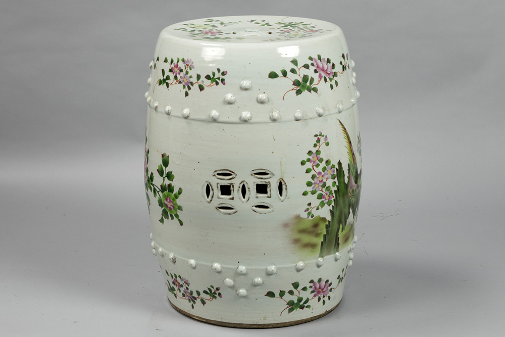 ’antique’ Chinese garden seat in porcelain with a ‘Famille Rose’ decor