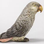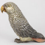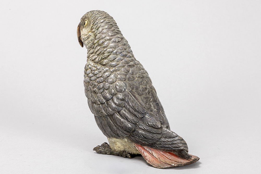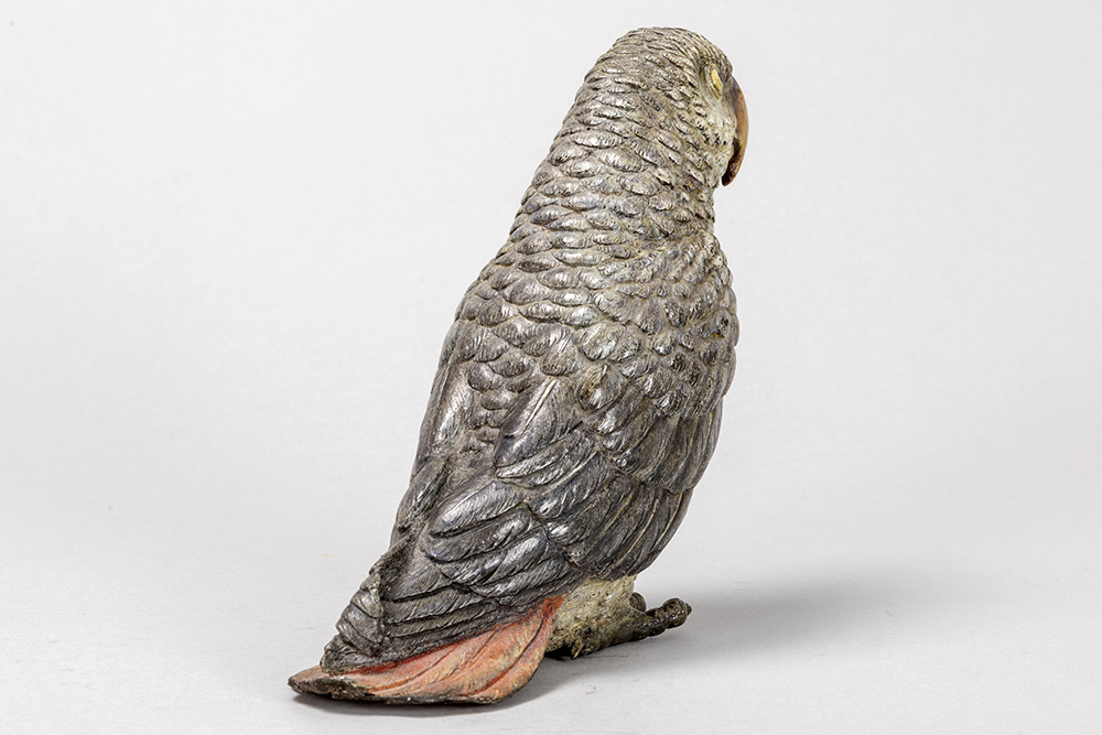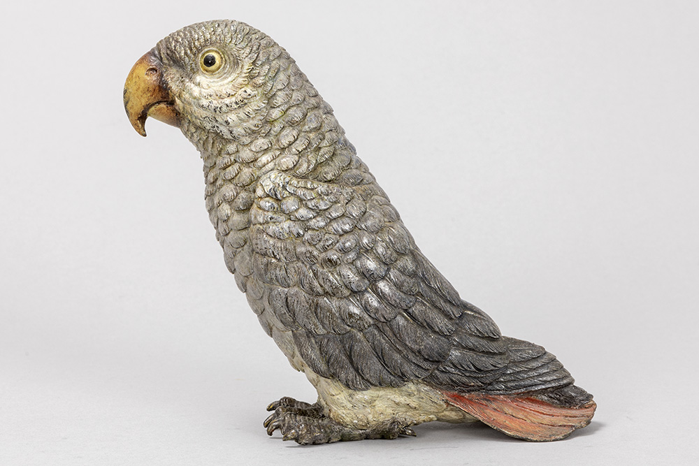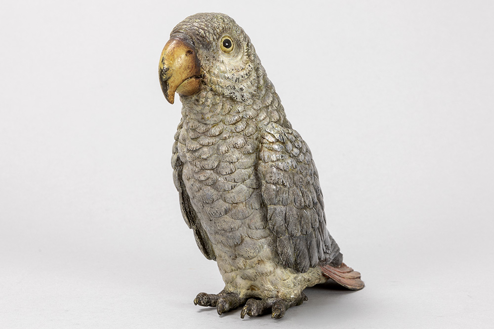 Franz Xavier Bergmann attributed ‘geschutzt’ marked animalier “African grey parrot” sculpture in cold-painted bronze