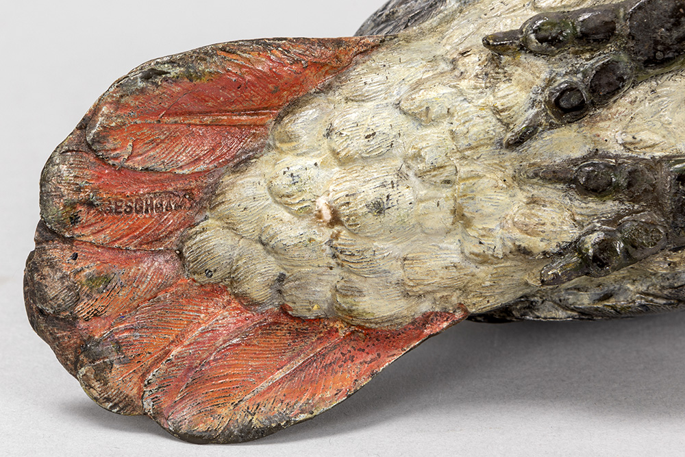 BERGMANN FRANZ XAVIER (1861 – 1936) animalier-sculptuur in koudbeschilderde brons : “Grijze roodstaart papegaai” – hoogte : 15,8 cm gemerkt ‘Geschutzt’ toegeschreven aan