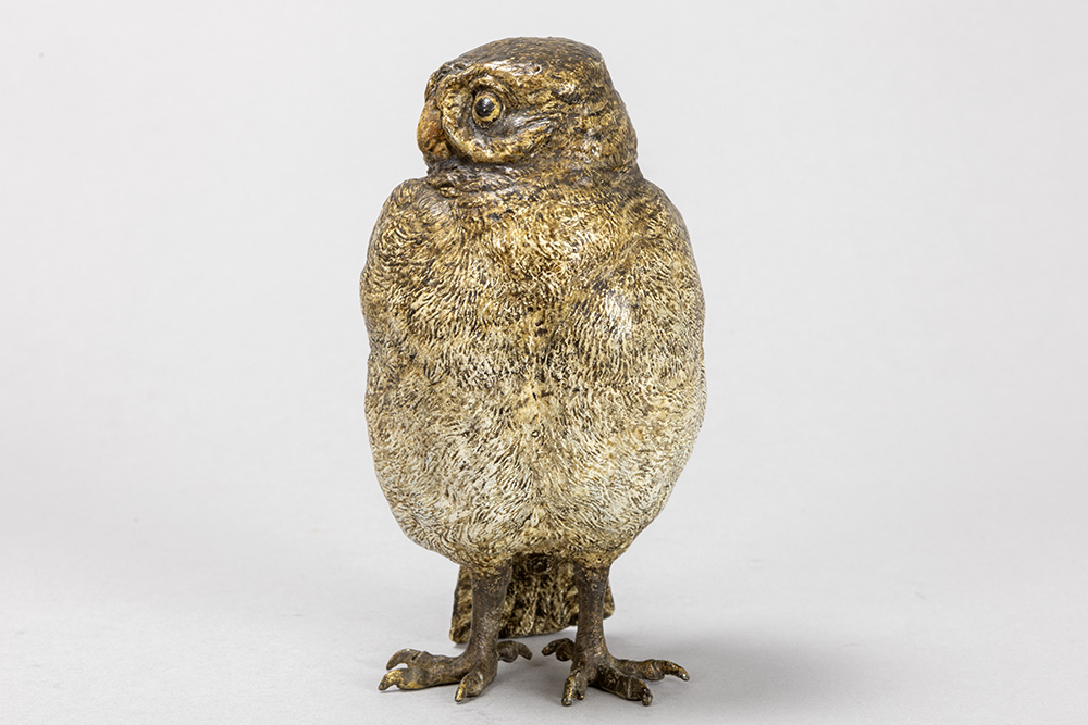 BERGMANN FRANZ XAVIER (1861 – 1936) animalier-sculptuur in koudbeschilderde brons : “Uiltje” – hoogte : 14 cm getekend ‘B’