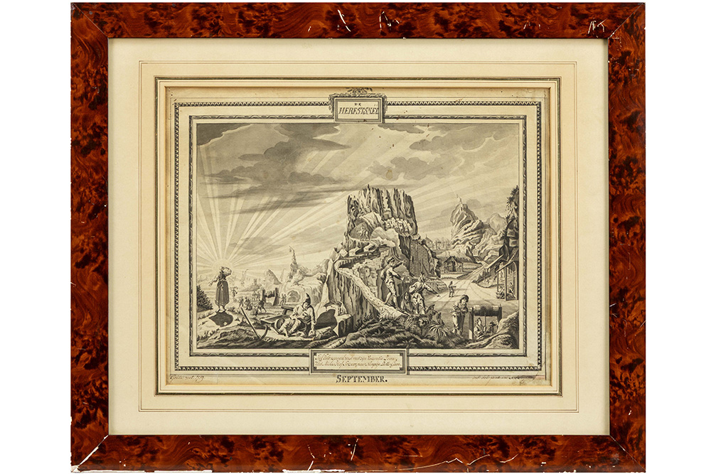 Achttiende eeuwse onleesbaar getekend Nederlandse grisaille-tekening getiteld “De Herfstsnee” – 30,5 x 39,5 gedateerd Gouda 1759