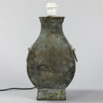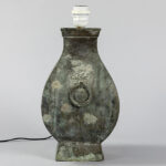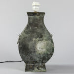 CHINA – HAN – DYNASTIE (206 voor – 220 na Christus) vrij grote zgn “Fang” – vaas op verhoogde voet in brons – hoogte : 34 cm – gemonteerd als lamp met certificaat van Axel Vervoordt