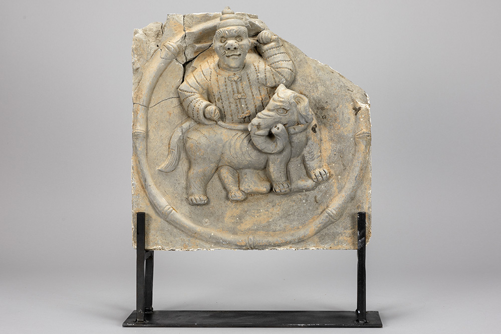 North Eastern Chinese Han period archaeological tomb ornament in ceramic with the depiction of a Chinese elephant tamer
