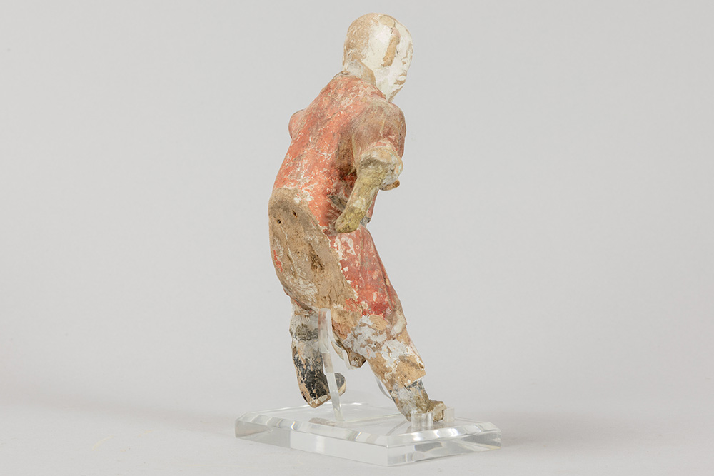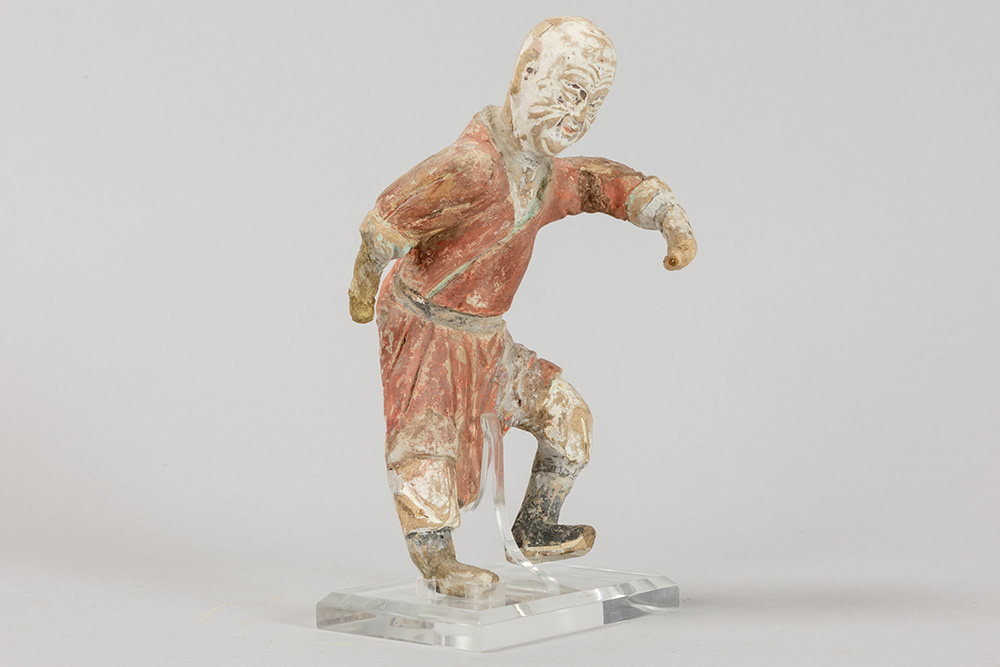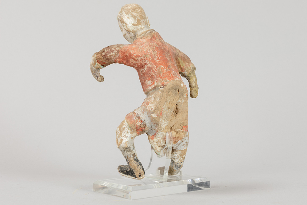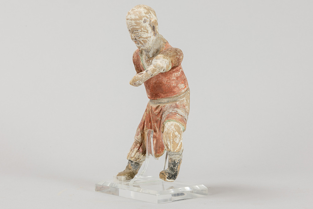 CHINA HAN – DYNASTIE (206 voor – 220 na Christus) 165 met goedbewaarde polychromie en met vrij zeldzame voorstelling van een dansende man met zeer expressief gelaat – hoogte : 18 cm – met plexi standaard