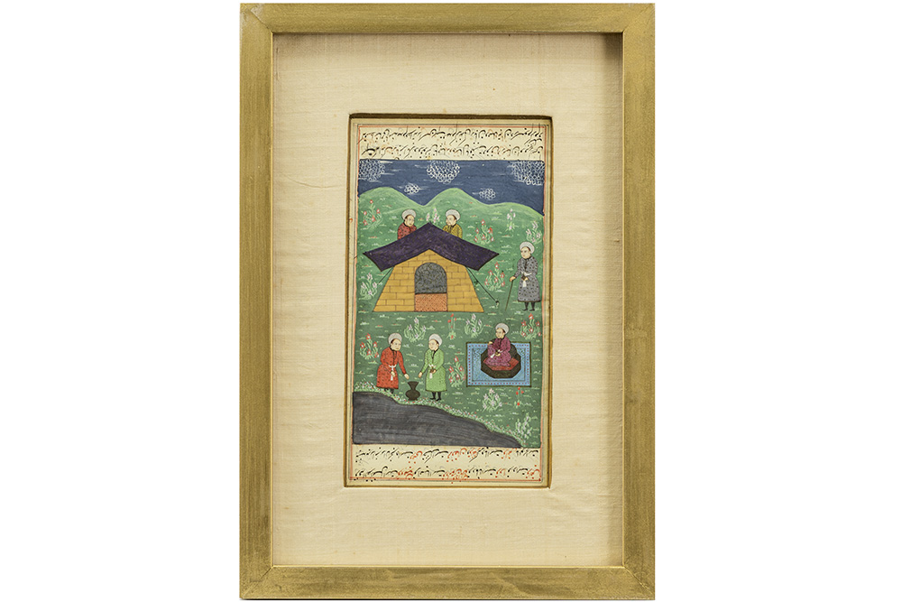 Kleine collectie van zes allicht achttiende eeuwse Perzische miniaturen (in twee kaders)