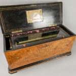 antique because of the big size quite rare musical box with organ and 12 tunes and with a case in burr wood and ebonized wood