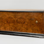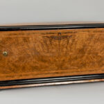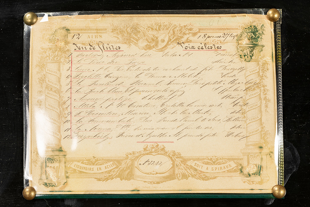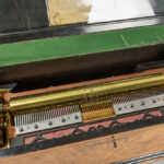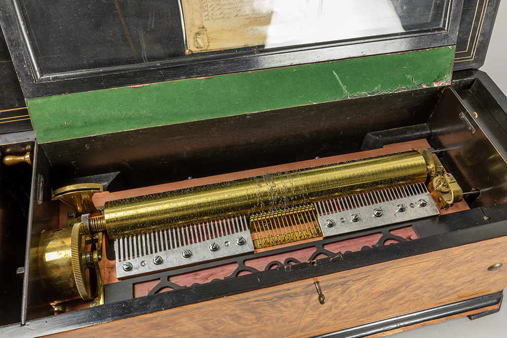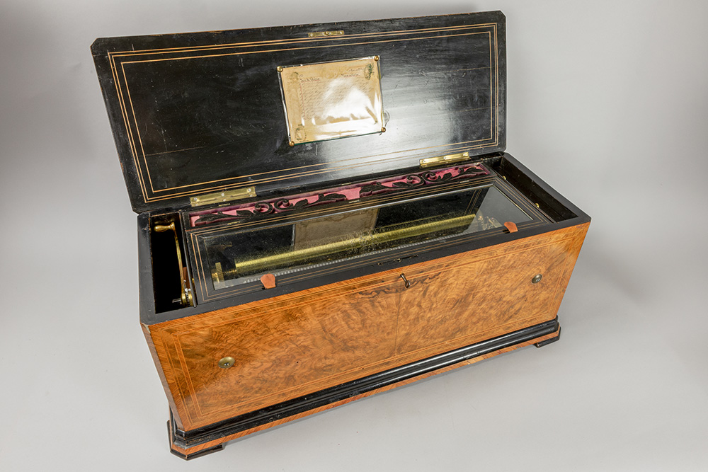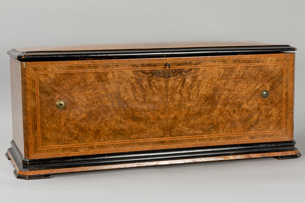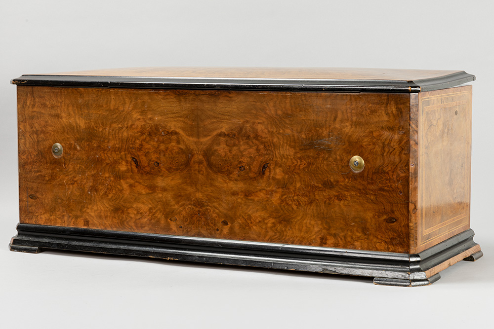 Antieke door het grotere formaat zeldzamere muziekdoos met orgel en twaalf melodieën en met een kast in wortelhout en geëboniseerd hout – 33 x 83 x 34 cm met restauratiedocument van 1947