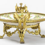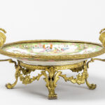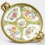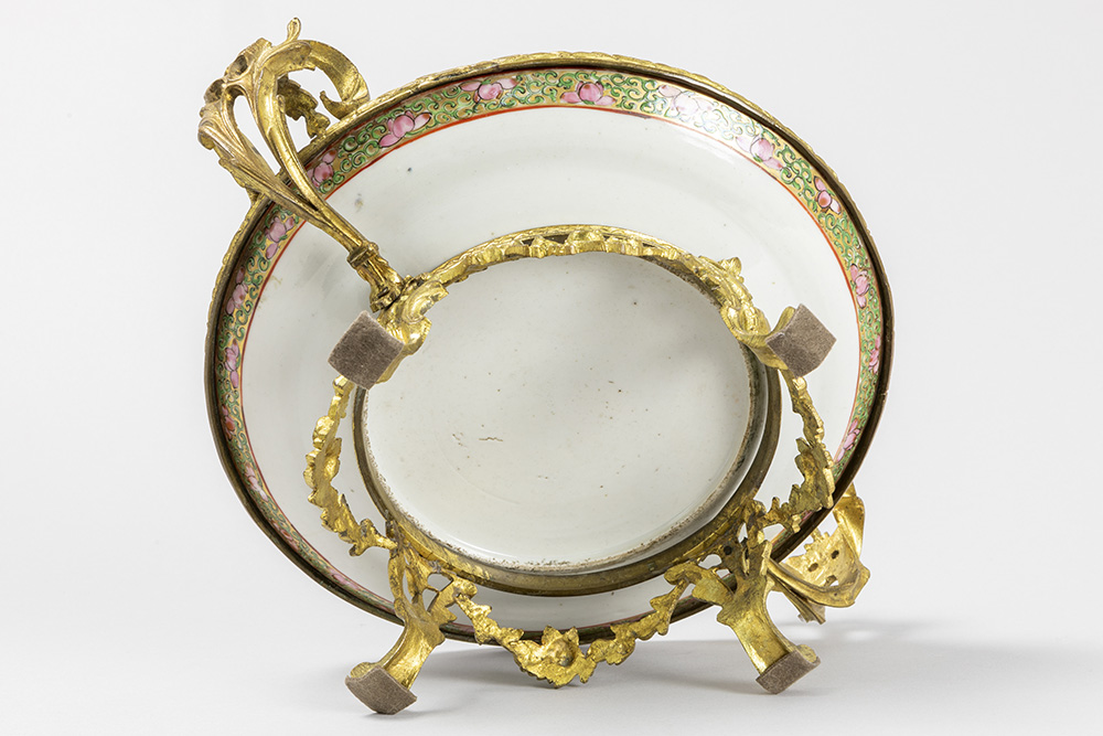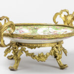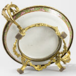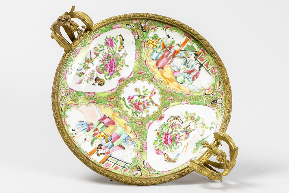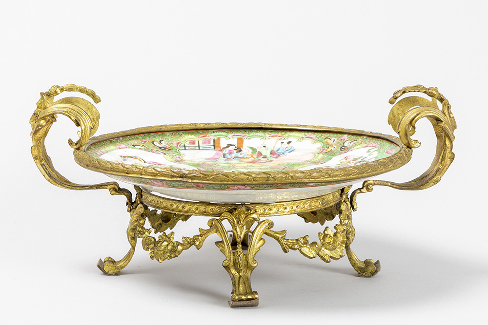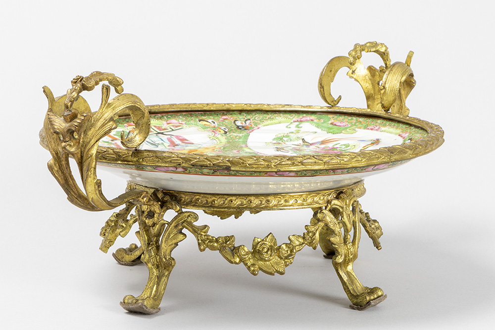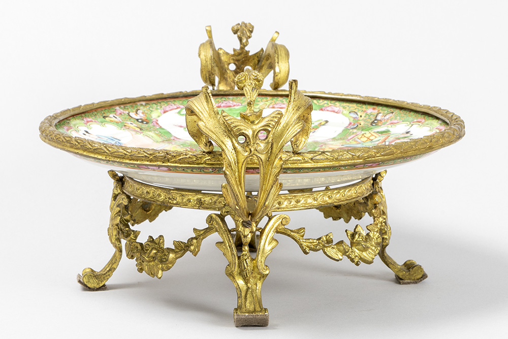 19th Cent. Chinese plate in porcelain with Cantonese decor mounted in a neoclassical tazza in gilded bronze