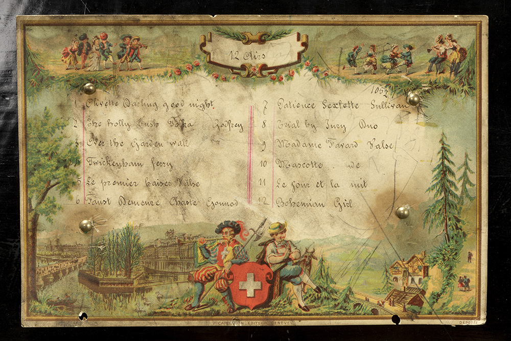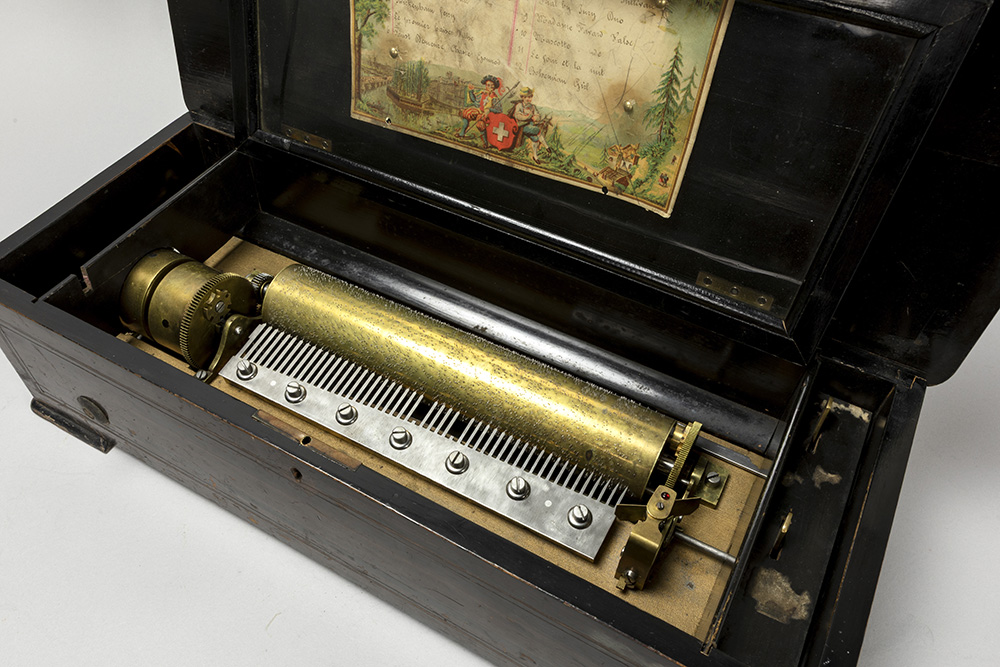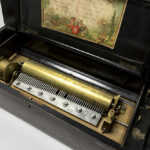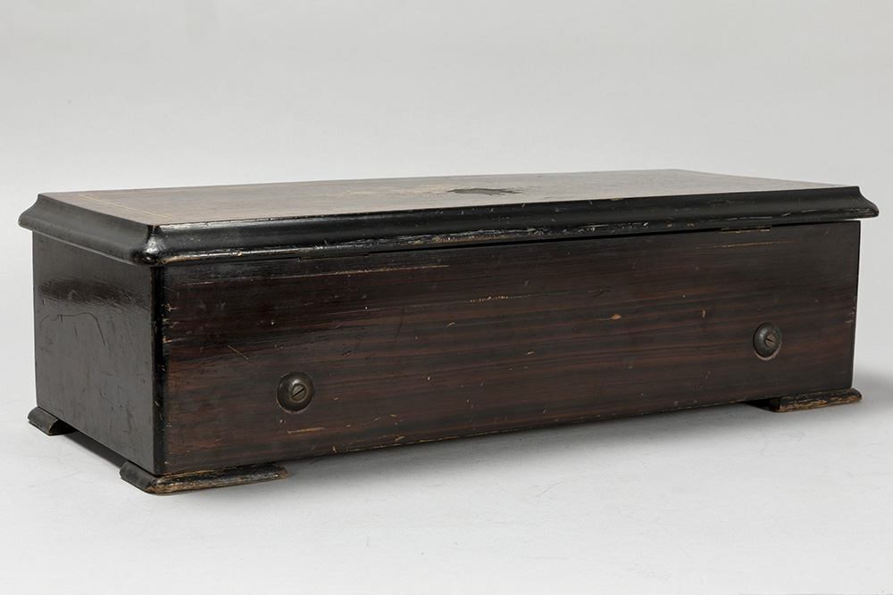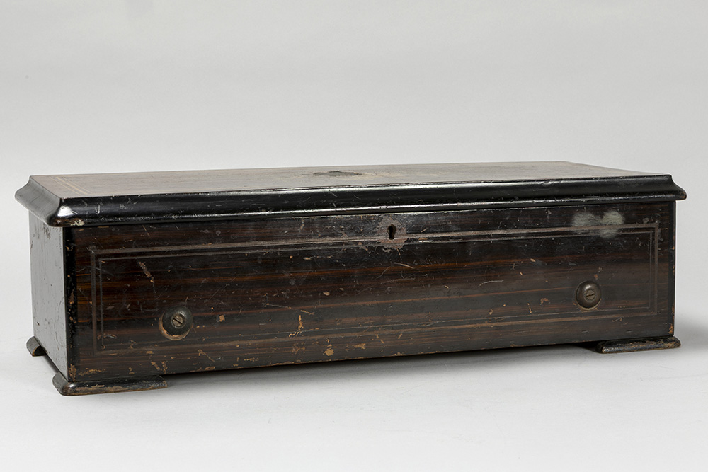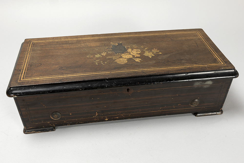 antique Swiss’ musical box with its case in inlaid rosewood