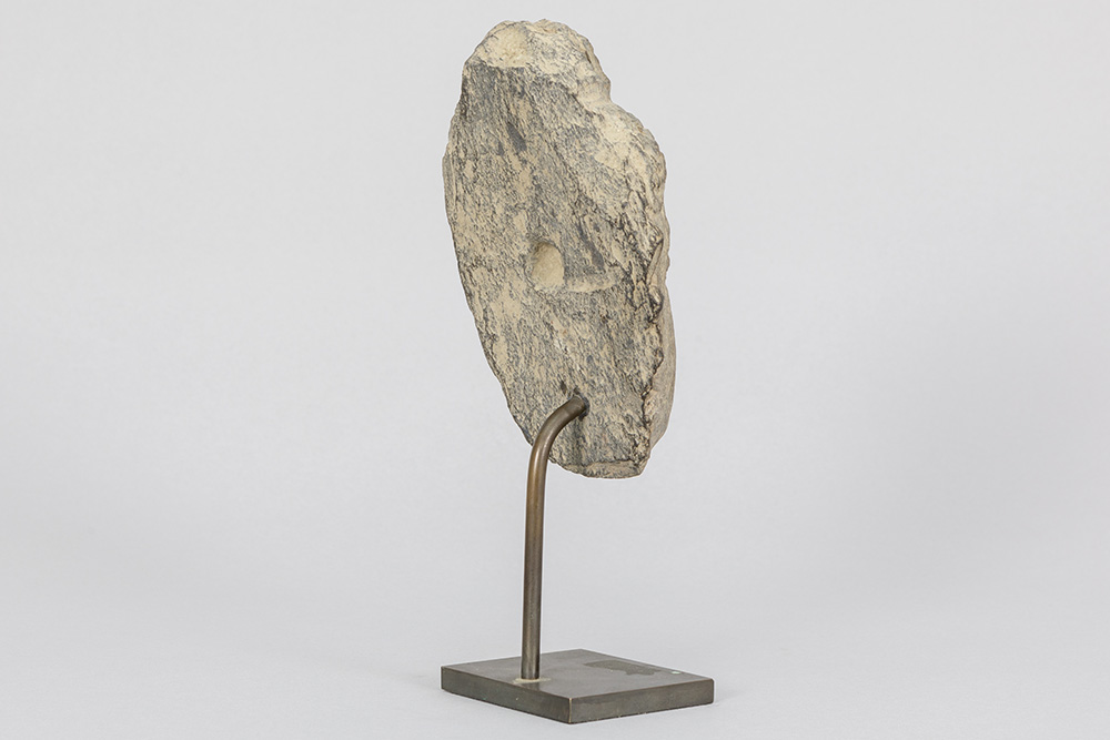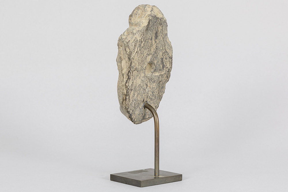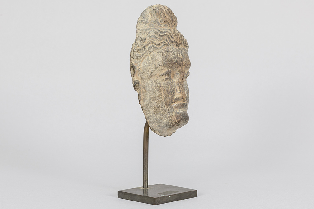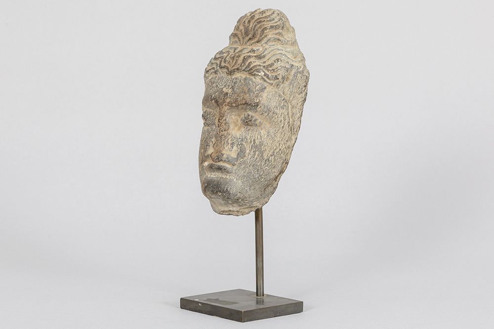 GANDHARA – 6° EEUW BC tot 11° EEUW fragment van een sculptuur in schist: “Hoofd van Boeddha” – hoogte : 15 cm – gemonteerd