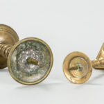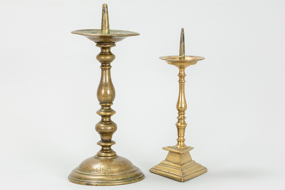Lot van twee zeventiende eeuwse kandelaars in koper – hoogtes : 23,5 en 28 cm