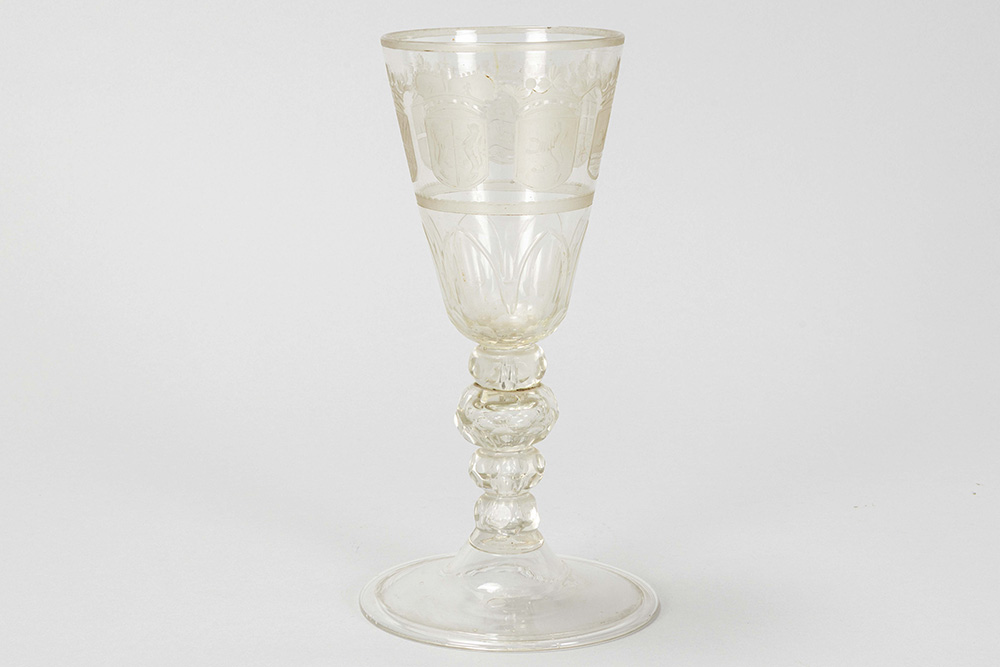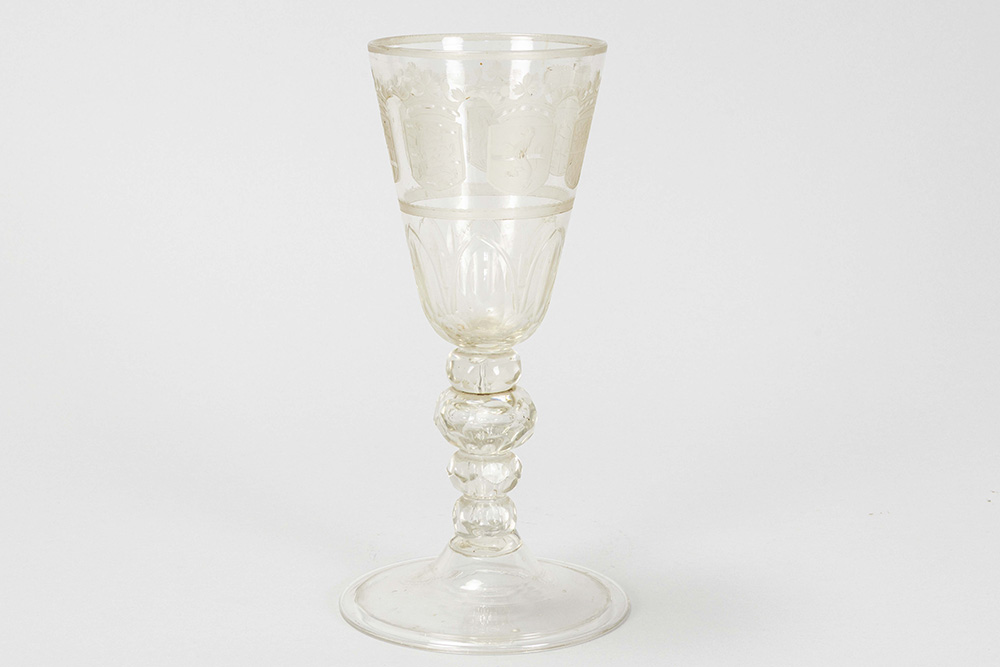 rare 18th Cent. beaker or goblet in clear glass with a with the chiseled image of the coats of arms of the Seven Provinces