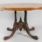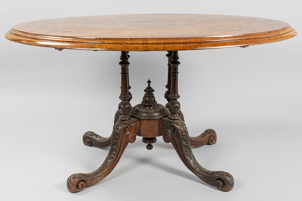19th Cent. Victorian table with an oval top in burr and marquetry resting on a sculpted base