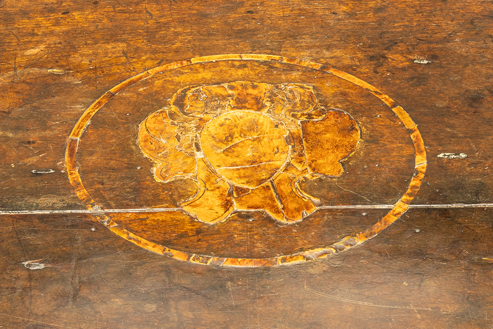 beautiful 16th/17th Cent. Renaissance style table in fruitwood with a narrow top, decorated with intarsia (shield shape) on two centrally connected cheeks with claw feet