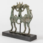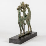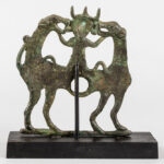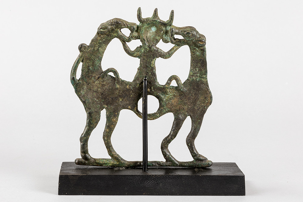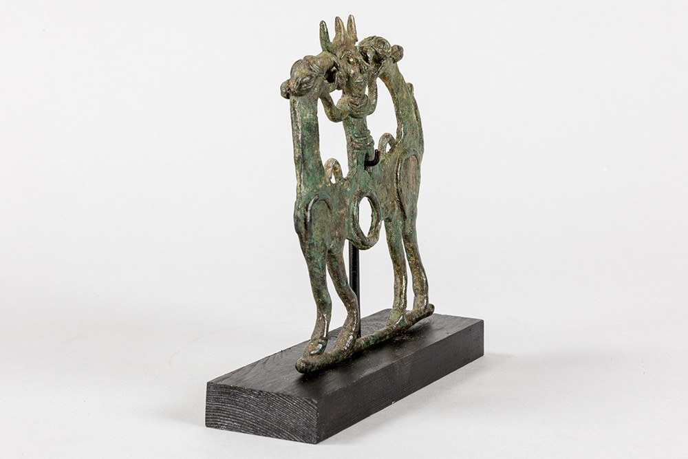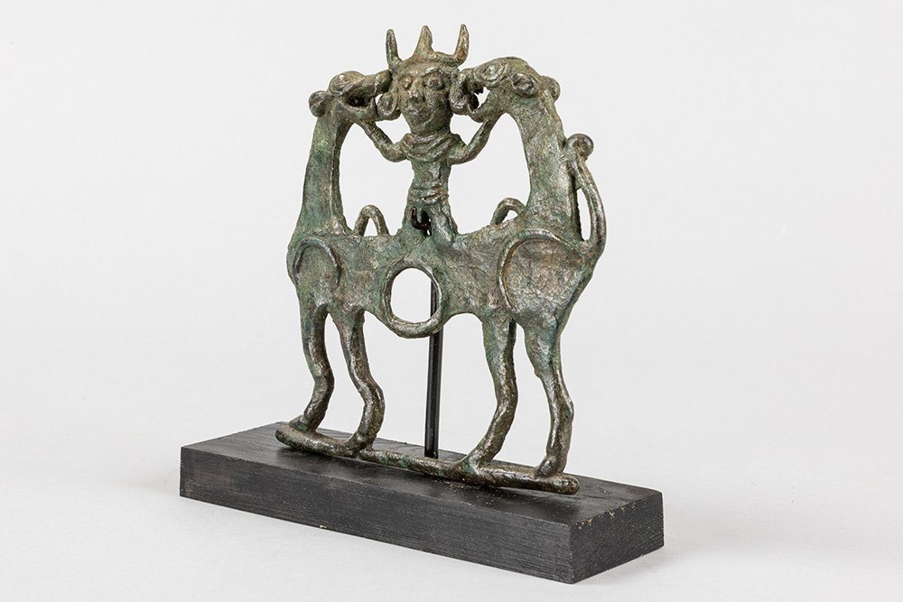 OUD PERZIË – LURISTAN – BRONSTIJD (ca 1000 tot 800 BC) zeldzame zijplaat van een paardenbit in brons met typische patine – 13,5 x 11,7 cm – gesokkeld ref : afbeelding op pag 161 van het boek “7000 jaar Perzische Kunst”
