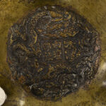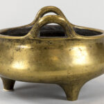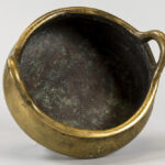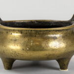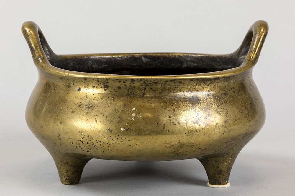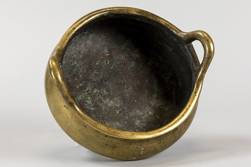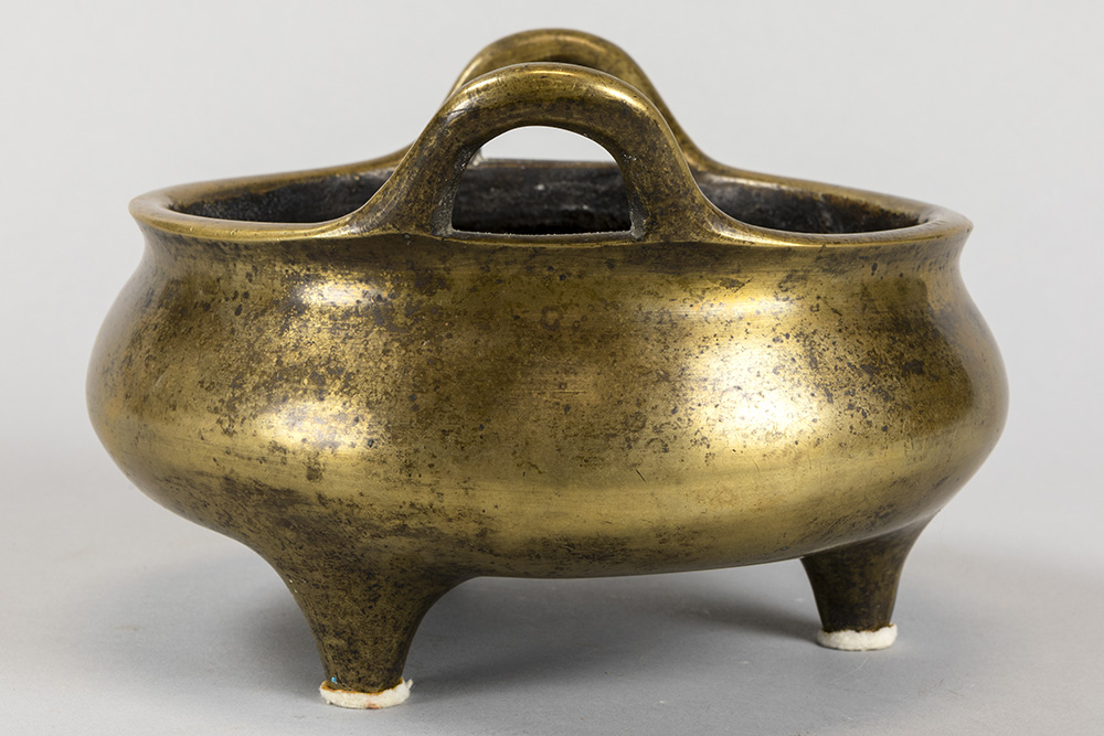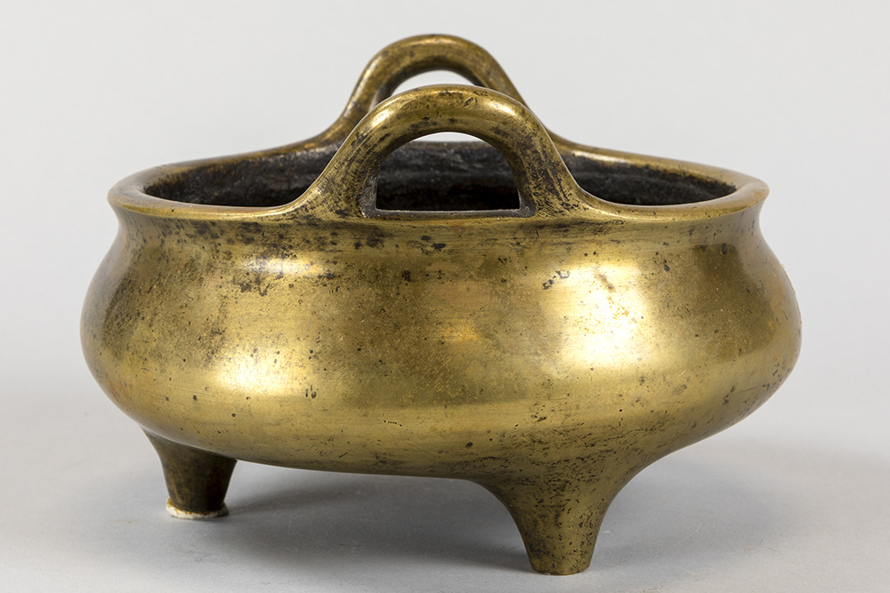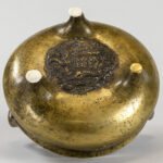 CHINA – QING-DYNASTIE (1644 – 1912) wierookbrander op drie pootjes in brons – diameter : ca 19,5 cm met onderaan een speciaal en fijn uitgewerkt merk met draken