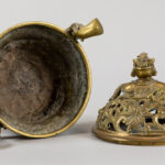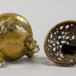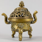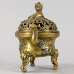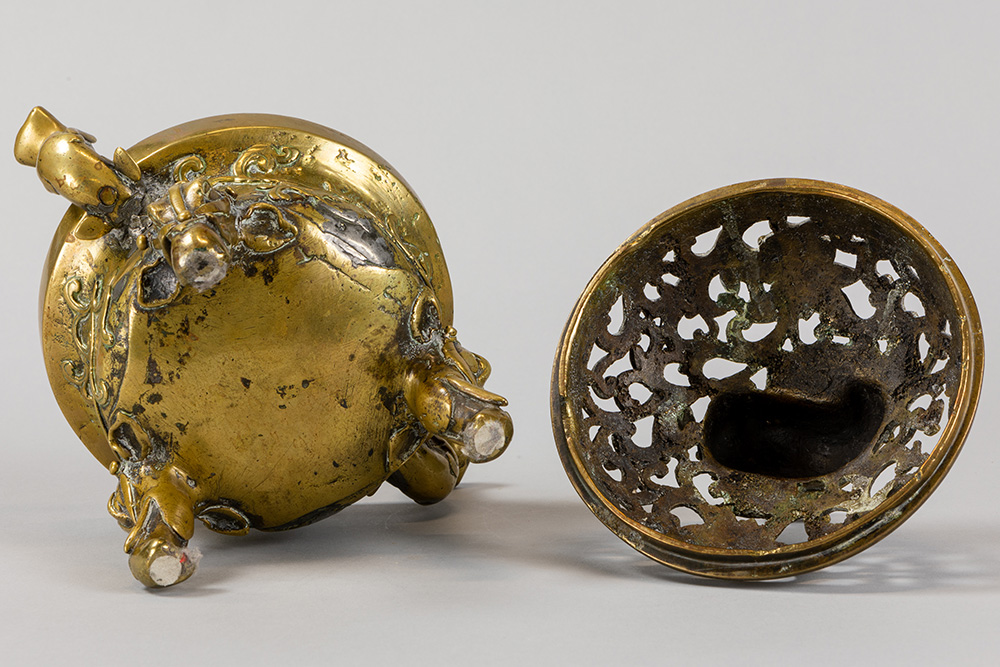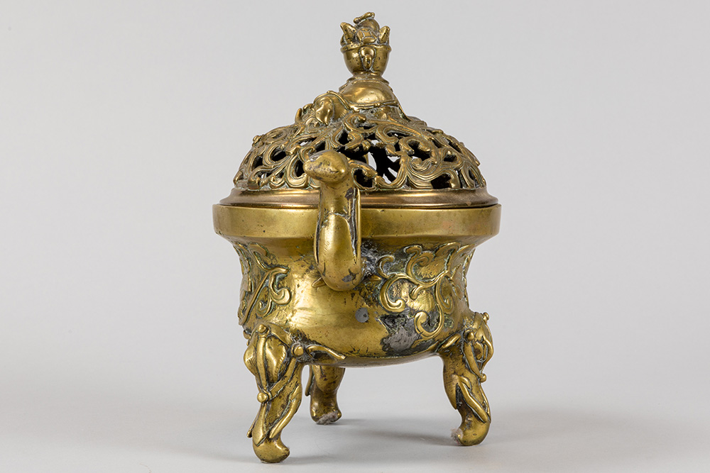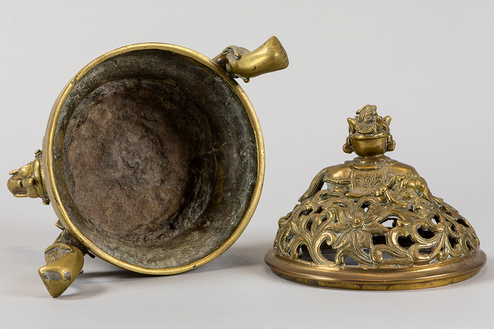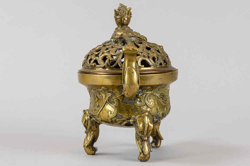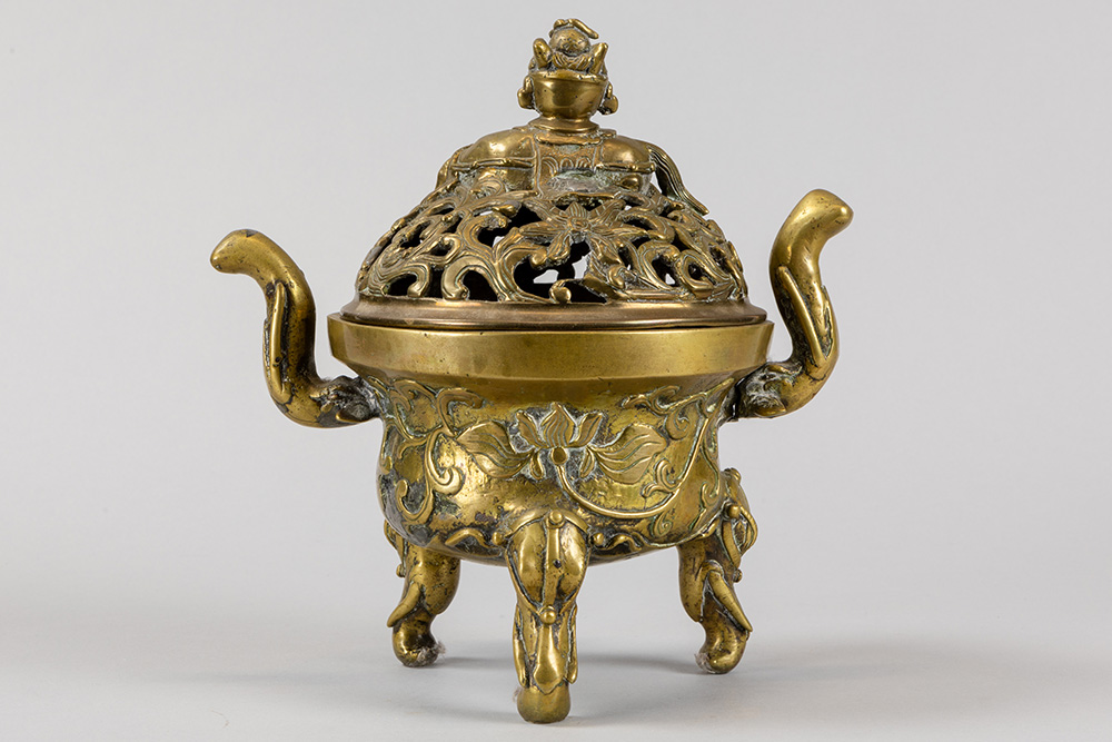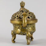 antique Chinese bronze incense burner with a lid with an elephant on top and with three feet in the shape of an elephant
