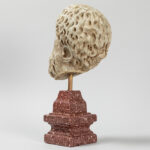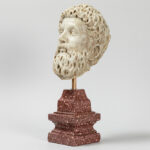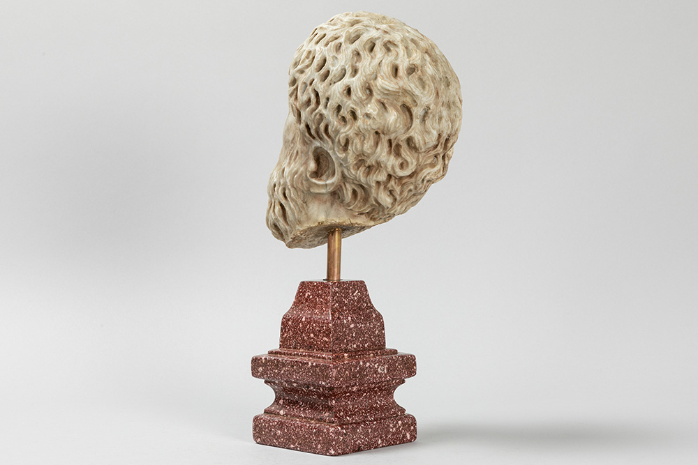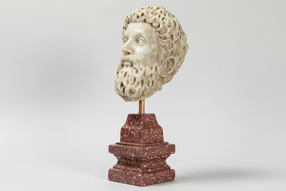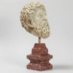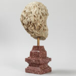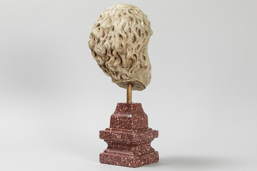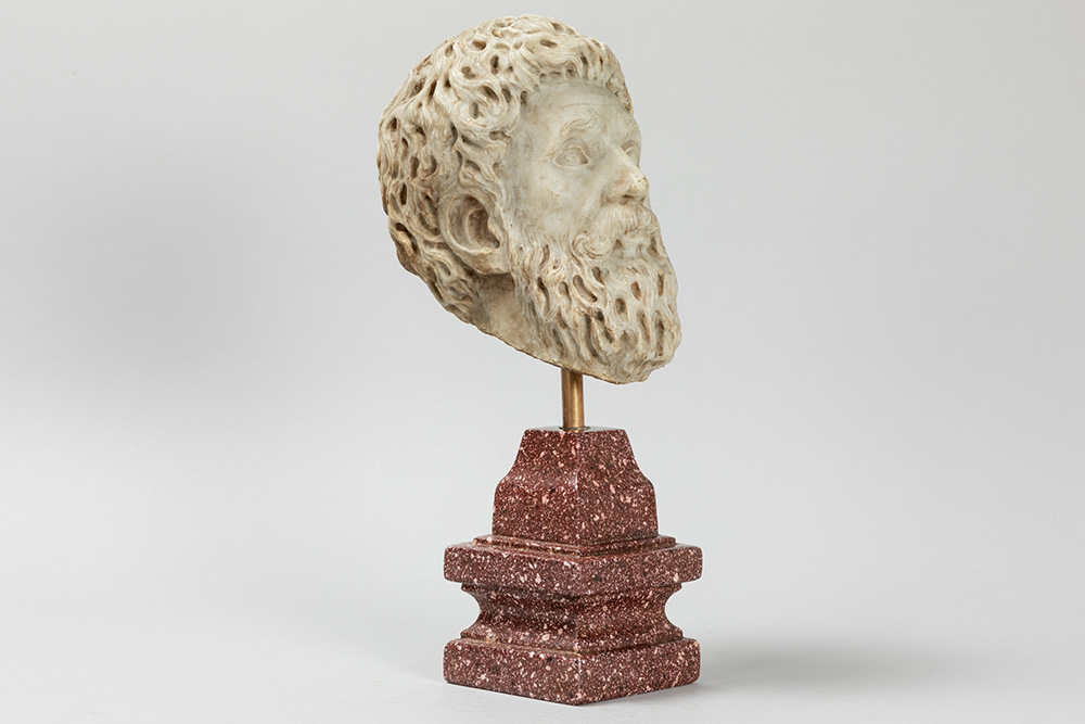 Oud-Romeinse sculptuur in marmer : “Hoofd van Marcus Aurelius” – hoogte : 21 cm – op een sokkel in porfier – totale hoogte : 36 cm prov : collectie van het voormalig prinselijk geslacht Ducas Comnenus