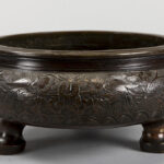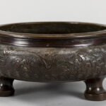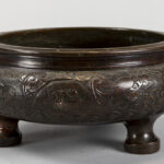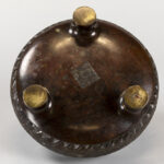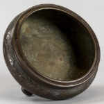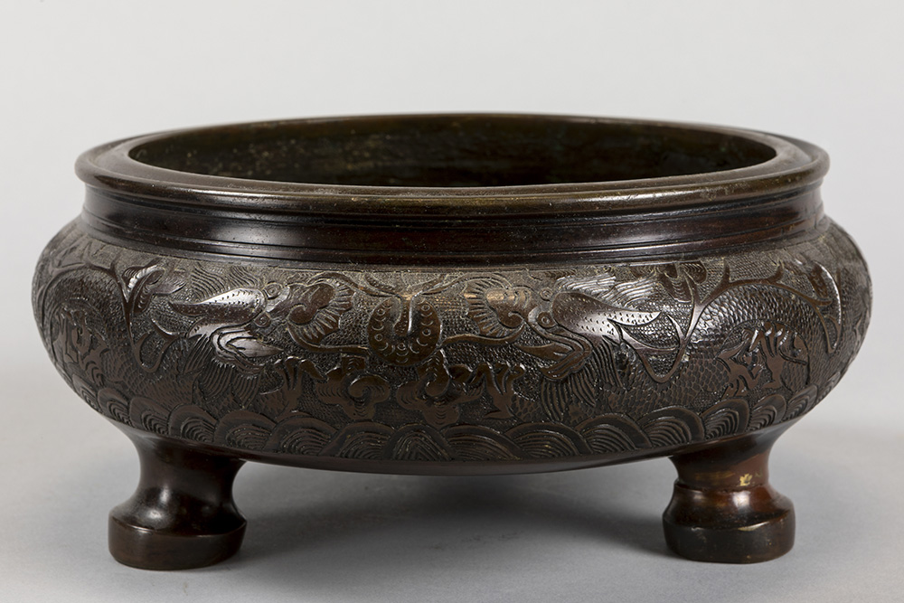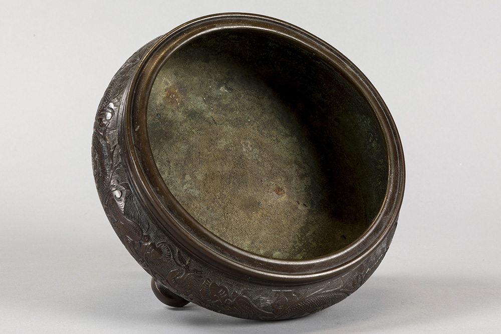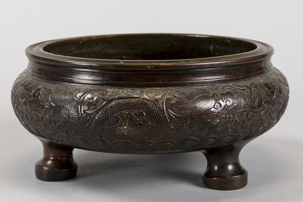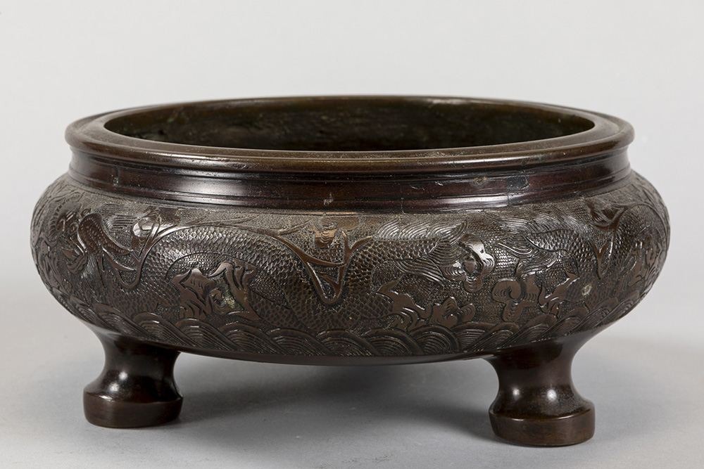 CHINA – QING-DYNASTIE (1644 – 1912) gemerkte wierookbrander op drie pootjes in brons met een drakendecor – diameter : 19,5 cm