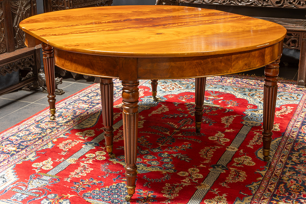 Antieke tafel in acajou met verlengbaar ovaal blad (met één tussenstuk in acajou) en met gecanneleerde poten – 75 x 136 x 120 (+ 50) cm