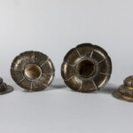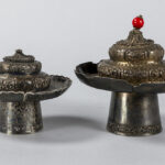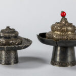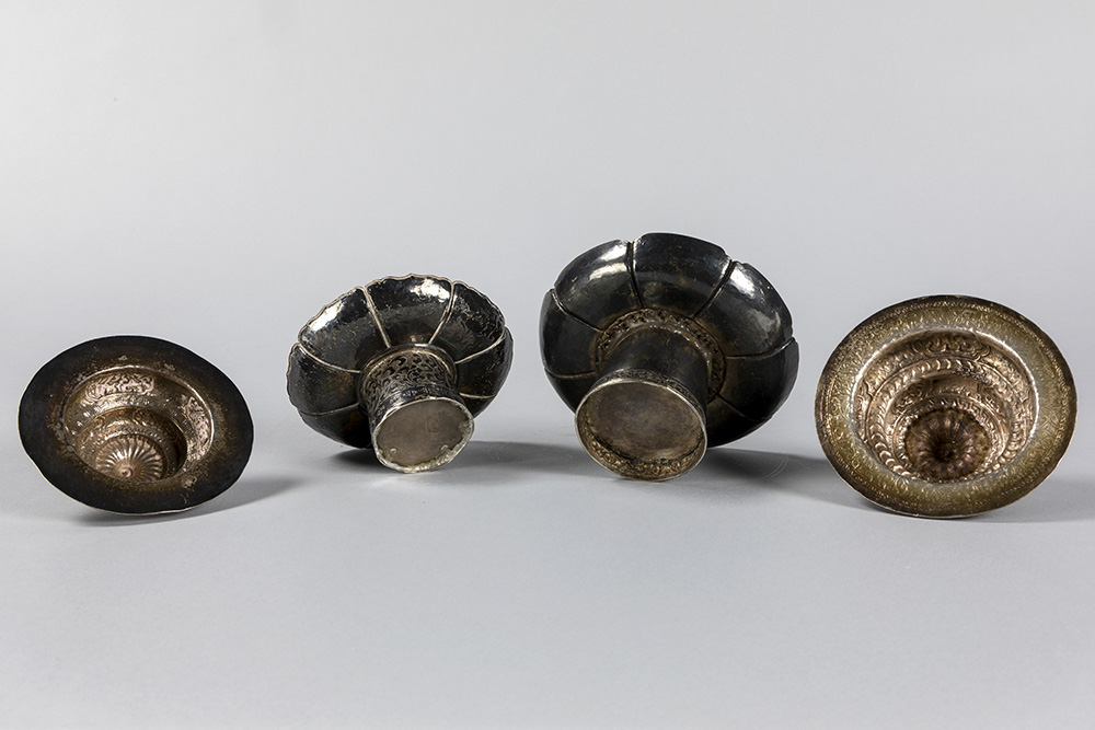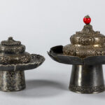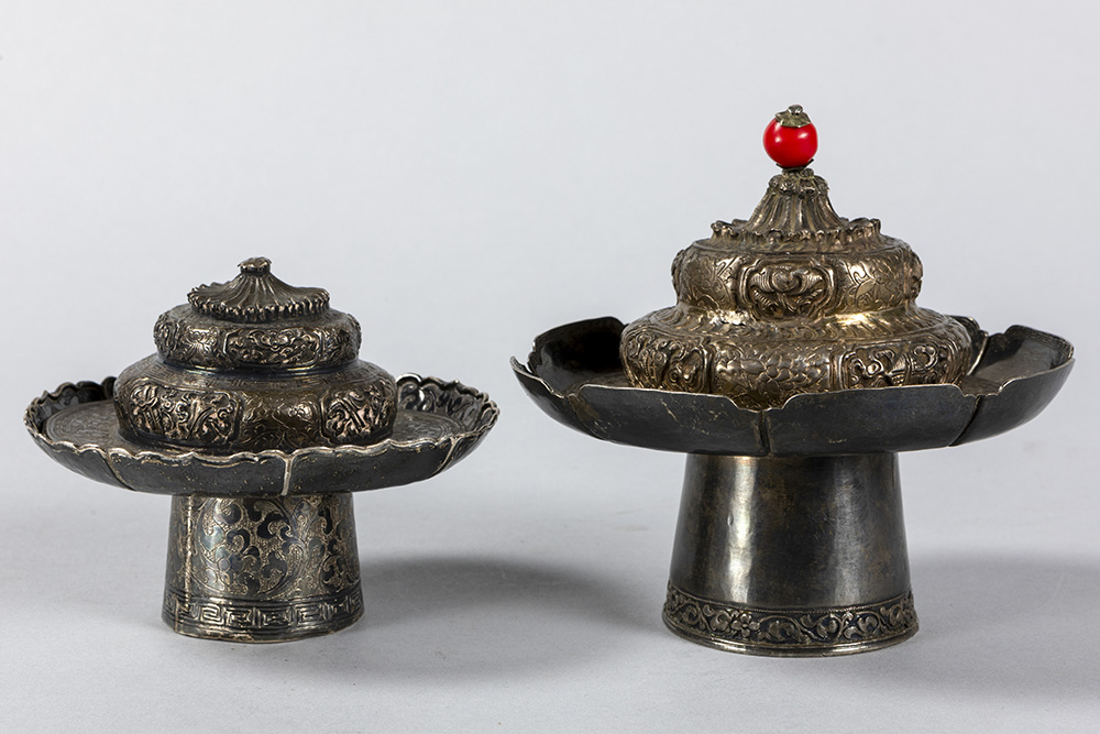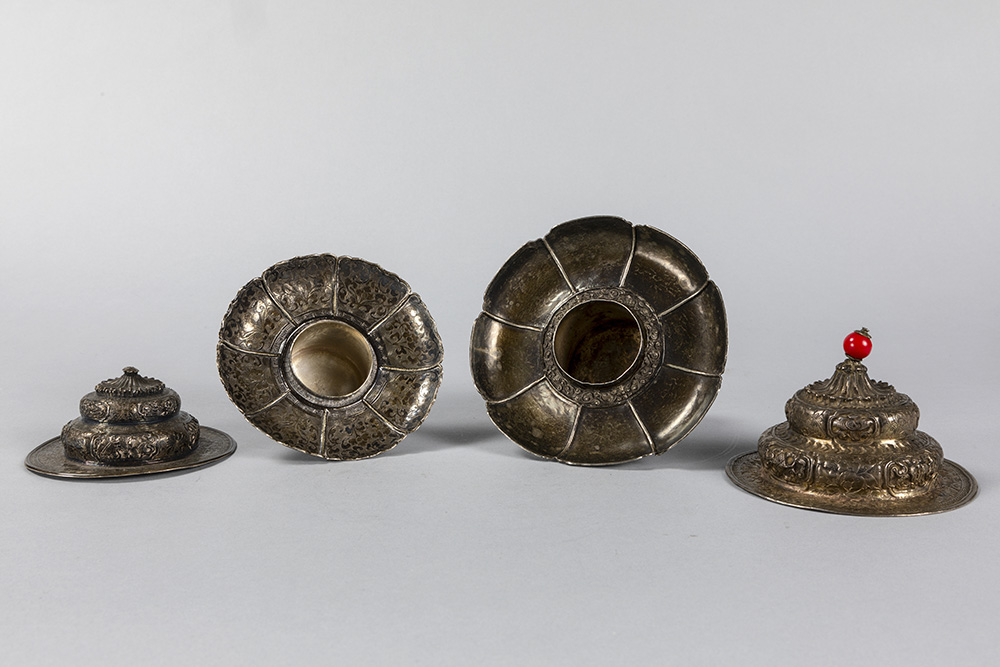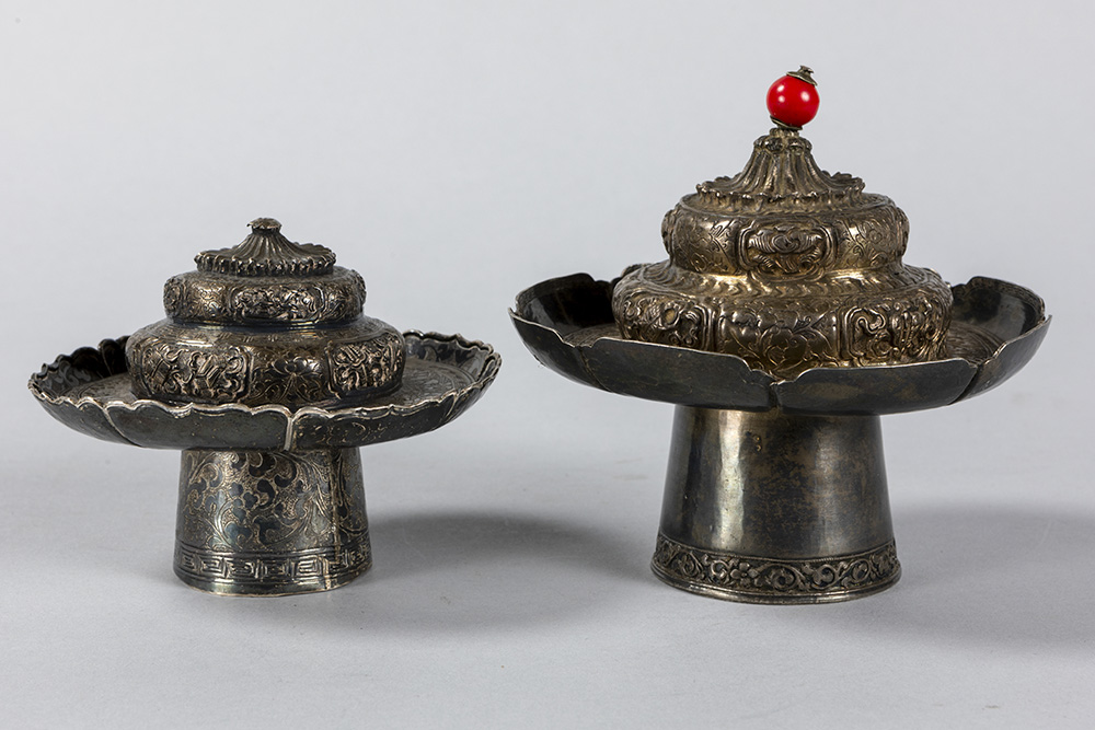 two Sino-Tibetan teacup holders with their lid in silver, each with an embossed decor