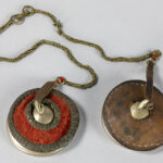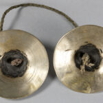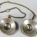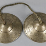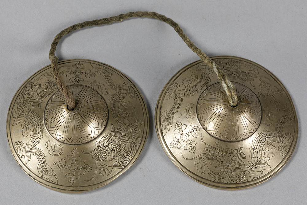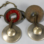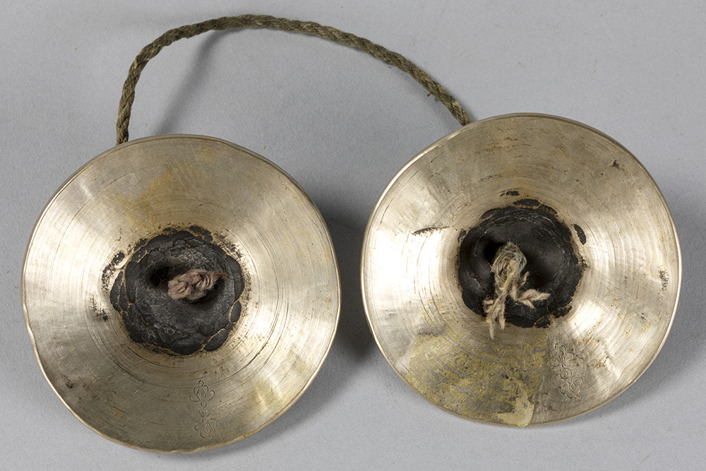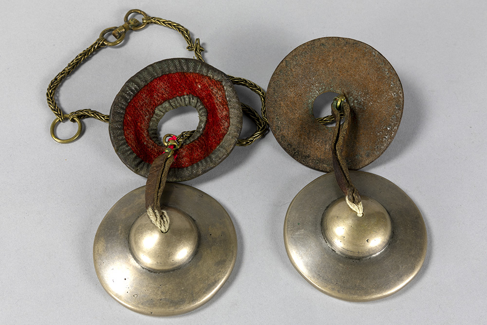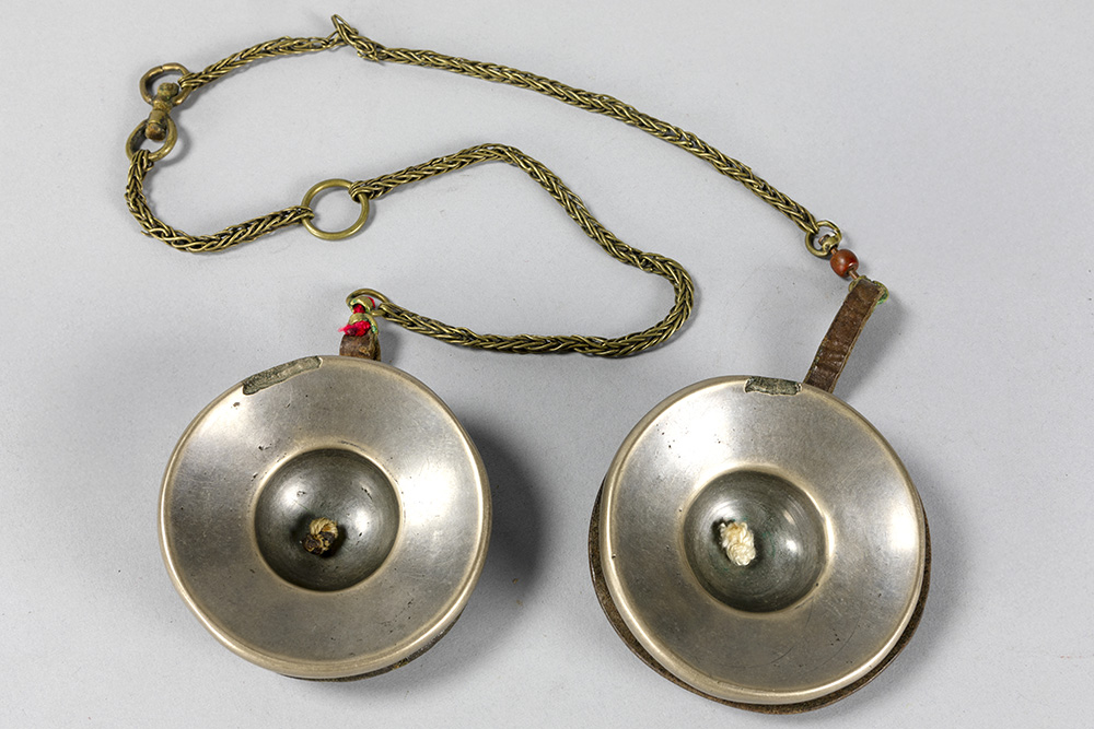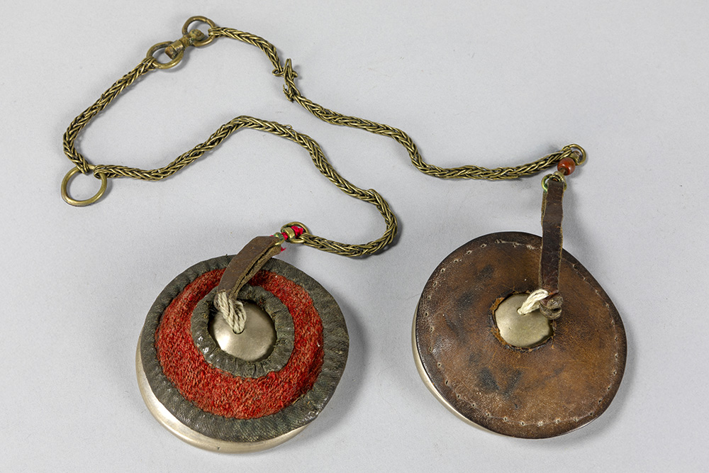 two pairs of Tibetan “Ting Sha” (hand gongs) in a copper alloy – the pair with the leather poach is antique