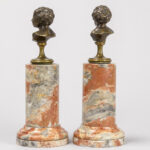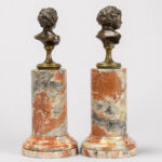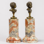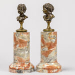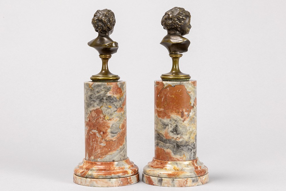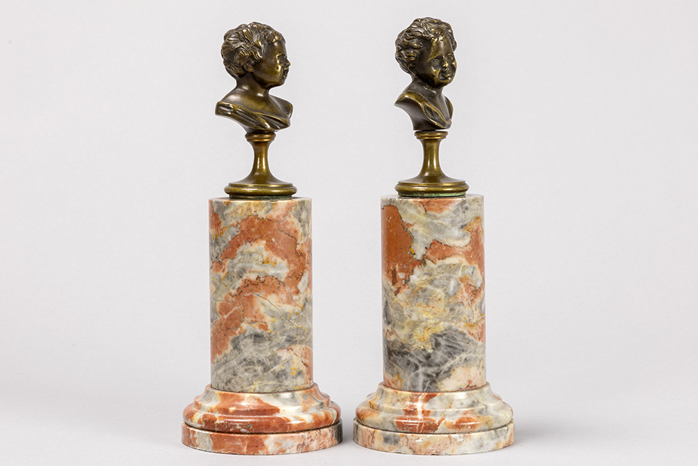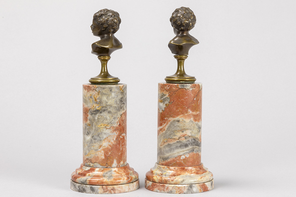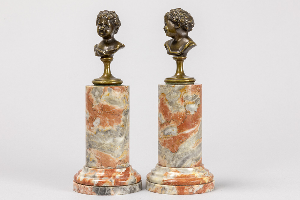 Paar antieke kinderbustes in brons, telkens op een marmeren zuiltje – hoogte : 20 cm