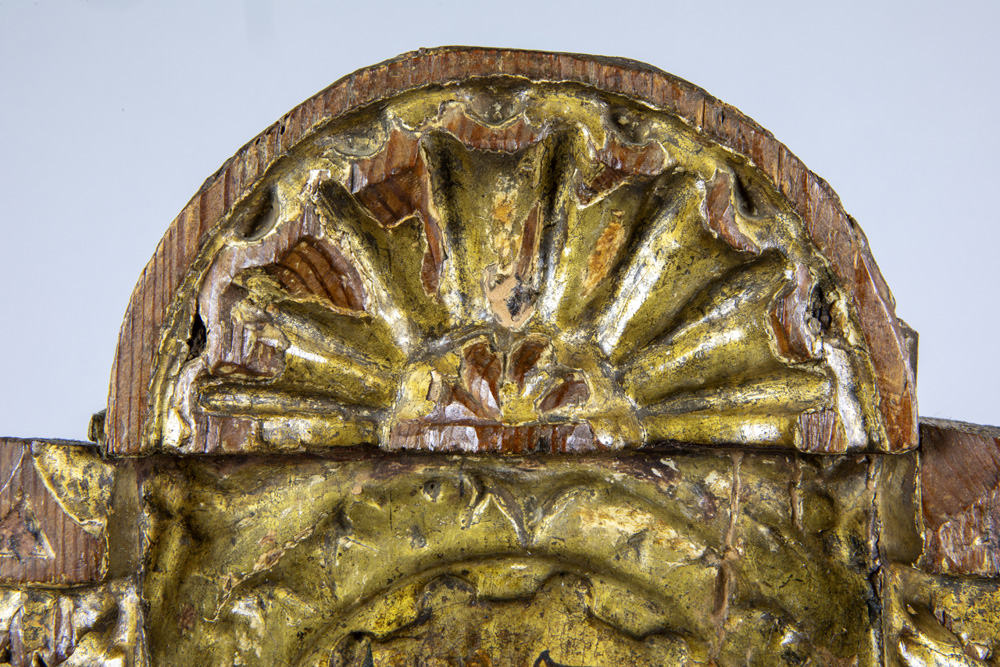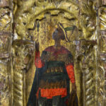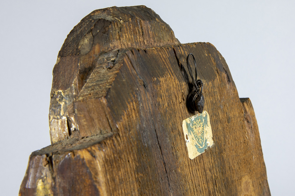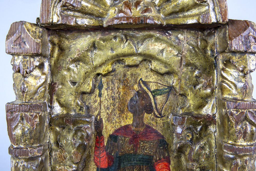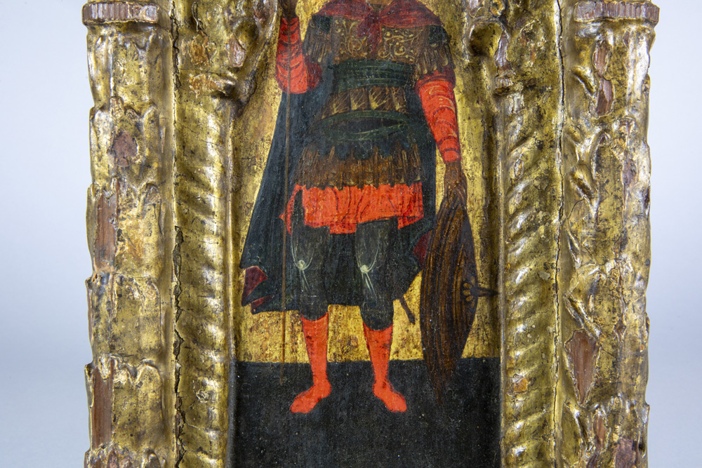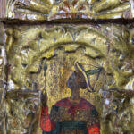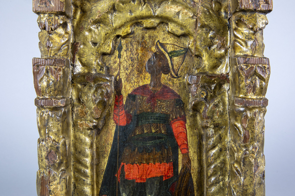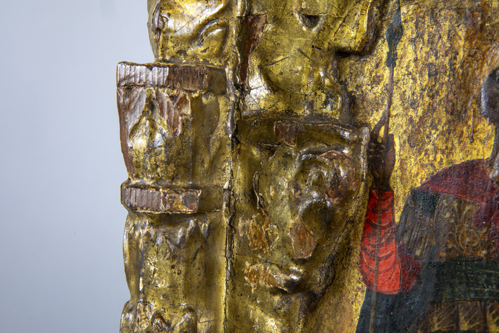 Byzantine tempera on an early 15th century panel depicting, according to the label on the verso, Constantine XI Palaiologos (Drageses), set within a gilded niche with Solomonic columns featuring Corinthian capitals beneath a ‘conch’ prov : collection of the former princely Ducas Comnenus family With carbon dating of the panel carried out by Kik-Irpa, which dates the panel with 68,2% probability between 1420 and 1445, and with 95,4% probability between 1410 and 1455. On the verso, a label has been affixed bearing the text “Basileus Constantine Palaiologos from the City” in Greek.