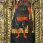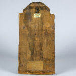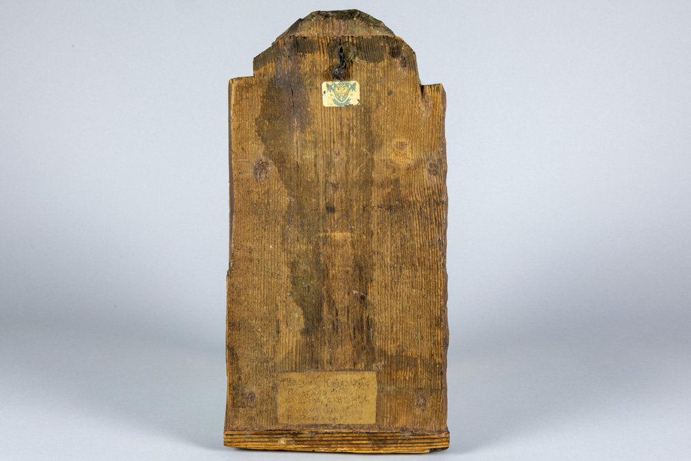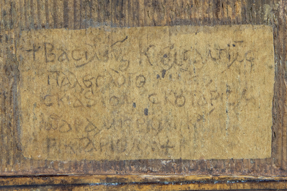tempera op vroeg vijftiende eeuws paneel met, afgaand op het label op verso, de beeldtenis van Constantijn XI Palaiologus (Drageses) in een gedoreerde nis geflankeerd door Salomon-zuilen met Korinthische kapitelen onder een ‘concha’ – 41 x 20,5 prov : collectie van het voormalig prinselijk geslacht Ducas Comnenus Met koolstofdatering van het paneel, uitgevoerd door Kik-Irpa, die het paneel met 68,2% zekerheid dateren tussen 1420 en 1445 en met 95,4% tussen 1410 en 1455. Op verso is een label aangebracht met de tekst “Basileus Constantine Palaiologos from the City” in het Grieks.