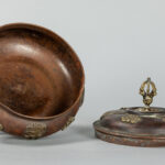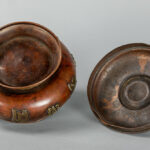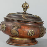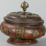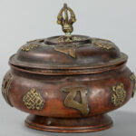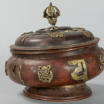 Oude Tibetaanse gedekselde pot in rood koper met geappliqueerde boeddhistische symbolen in geel koper – hoogte : 15,2 cm