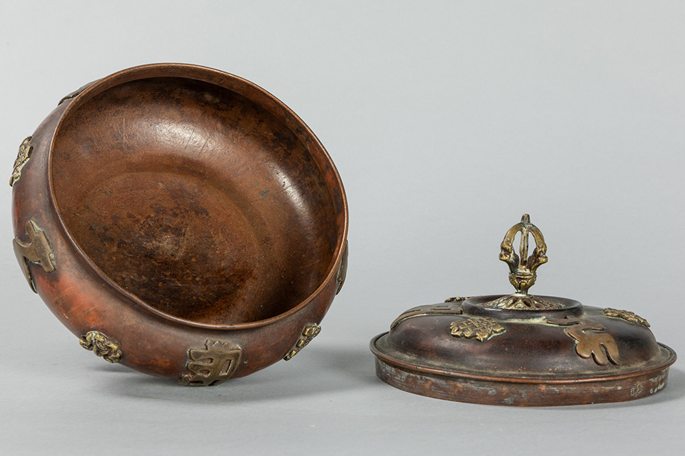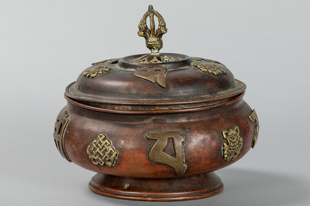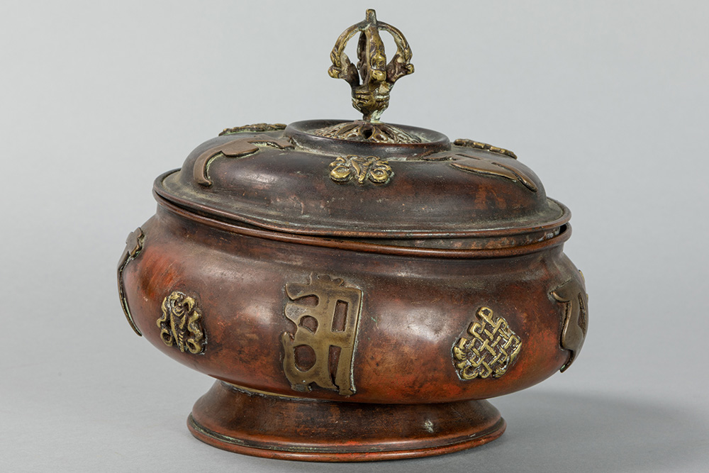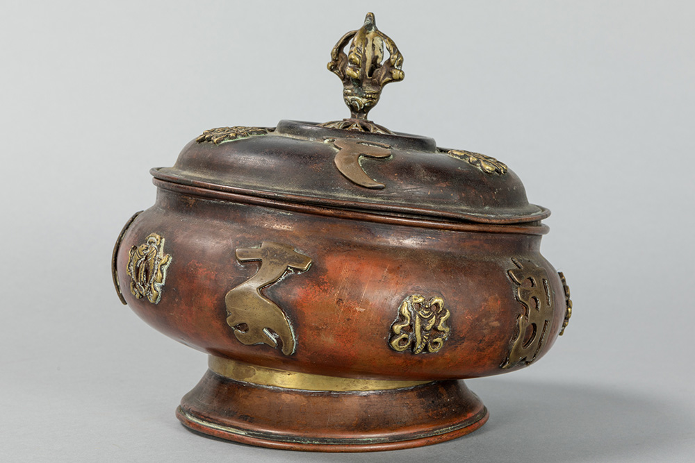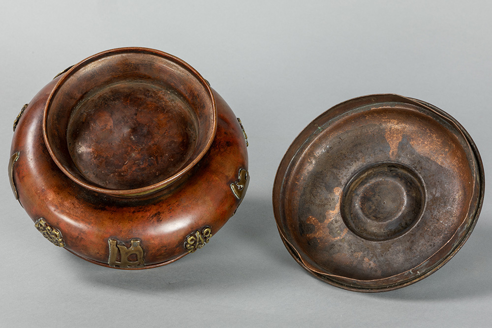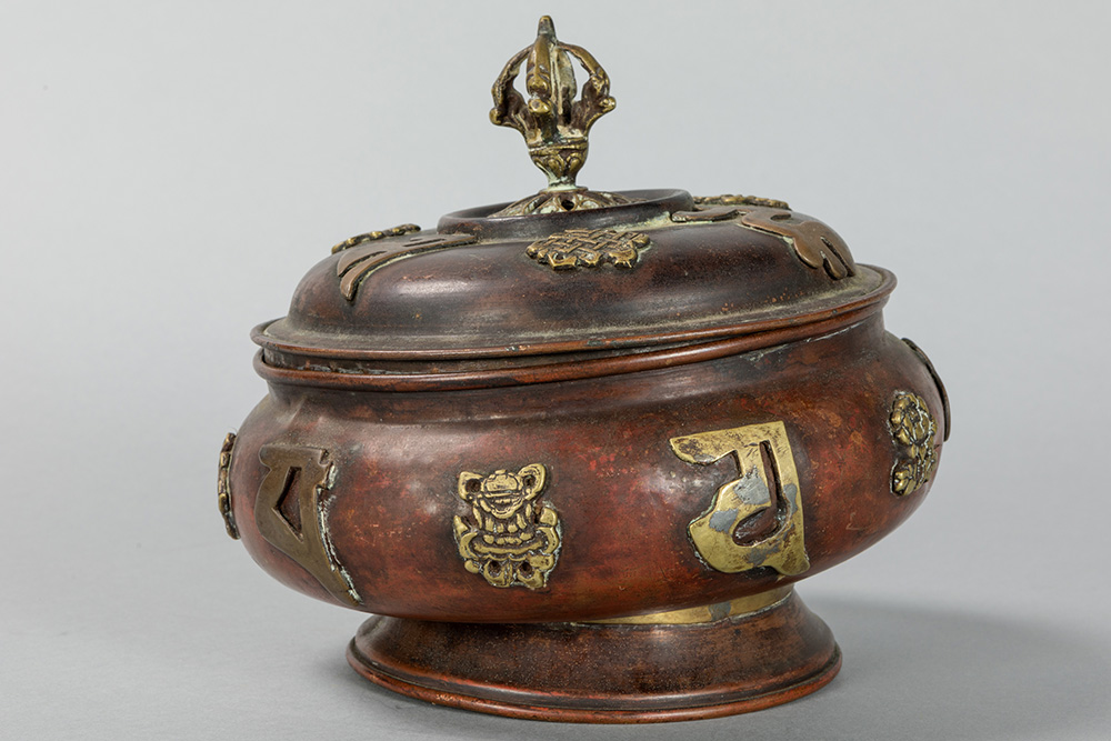 old Tibetan lidded pot in red brass with appliqued Buddhistic symbols in yellow brass