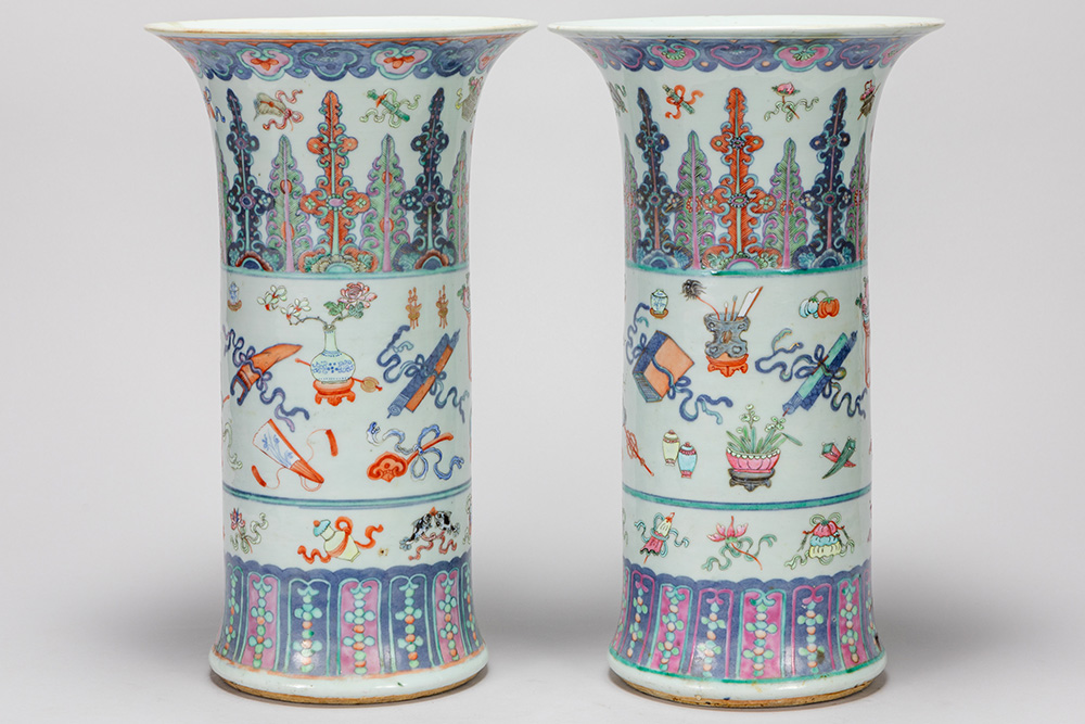 Mooi paar negentiende eeuwse Chinese vazen in porselein met een polychroom decor – hoogte : 41,5 cm Door de overgrootvader van de erfgenamen meegebracht uit China, nadat hij er als ingenieur had gewerkt.