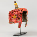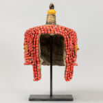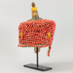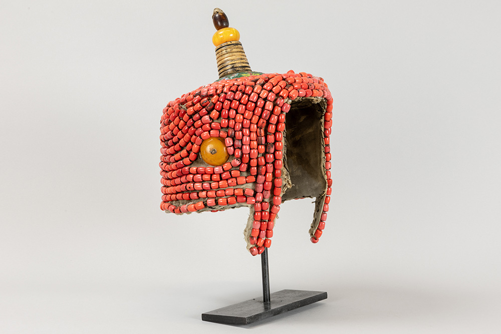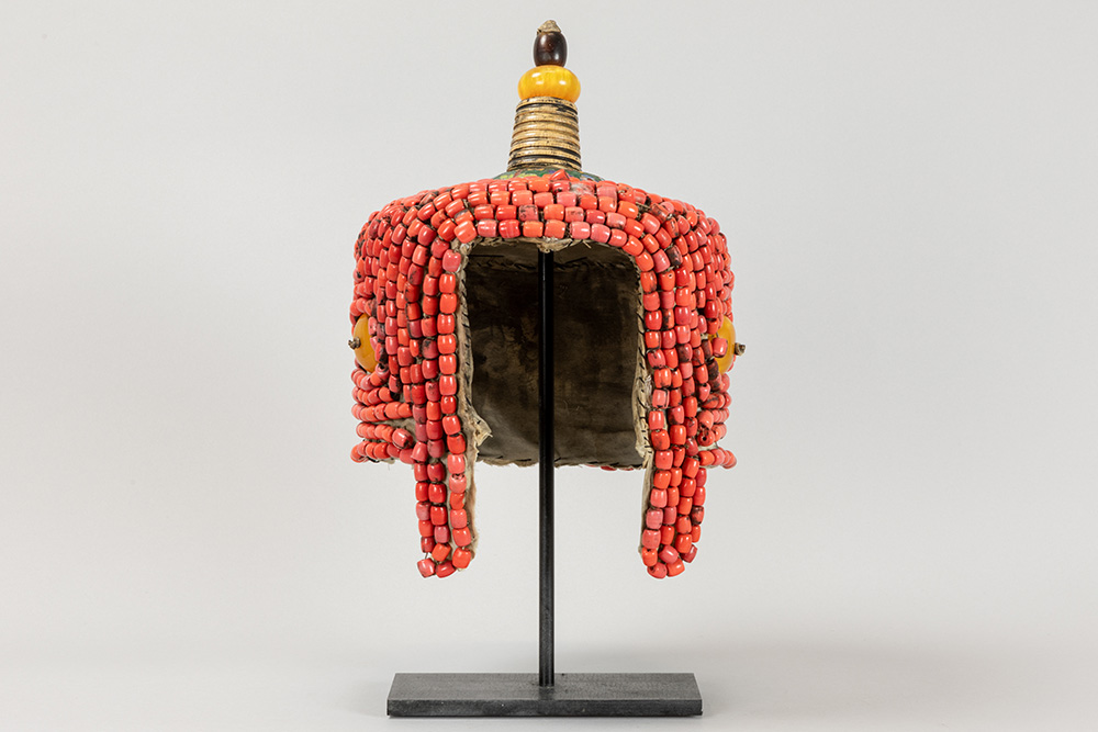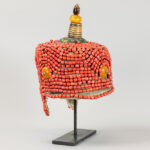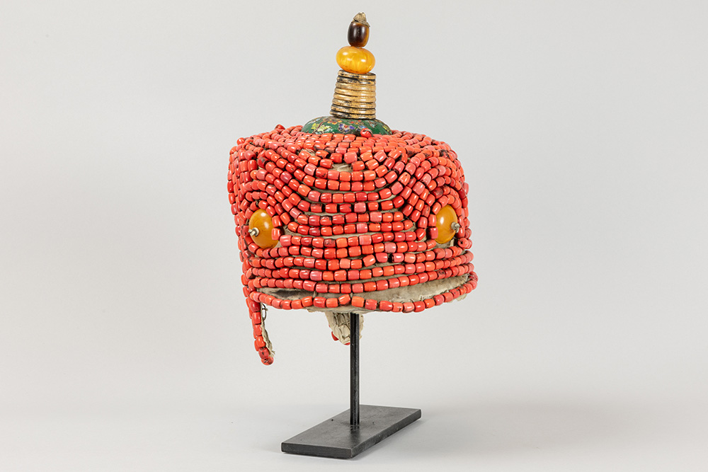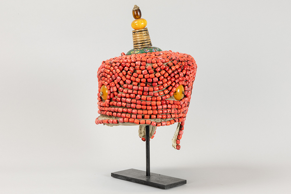 Mongoolse of Tibetaanse rituele kroon met kralen en schijven amber op textiel en met top in cloisonné, metaal en amber – hoogte : ca 37 cm – op standaard