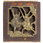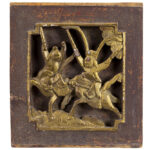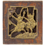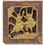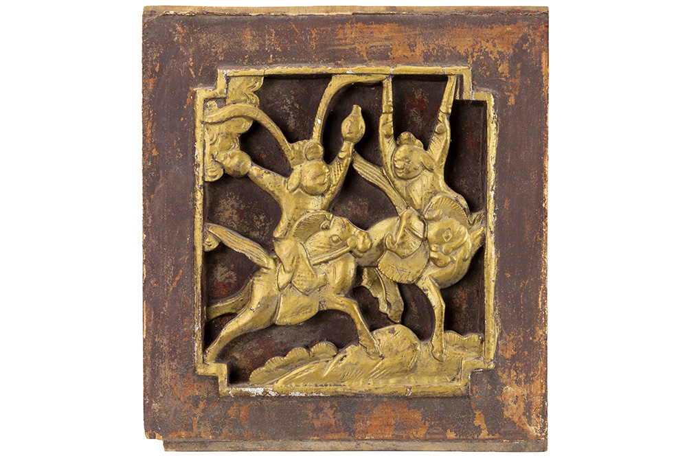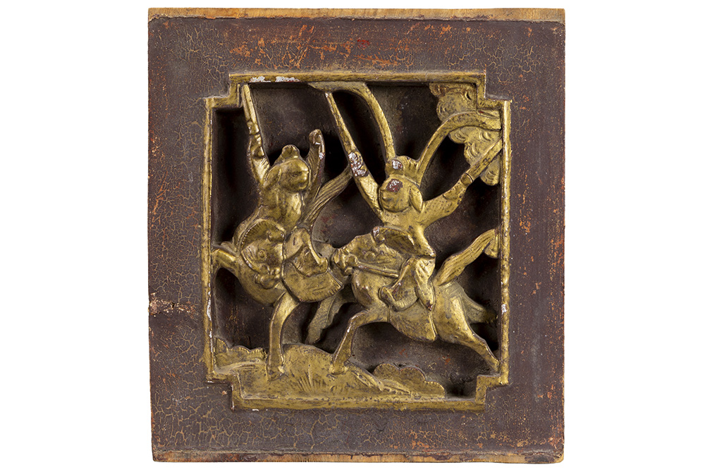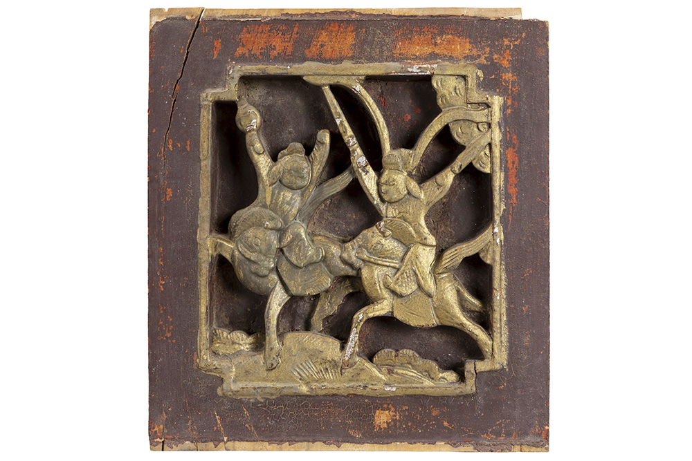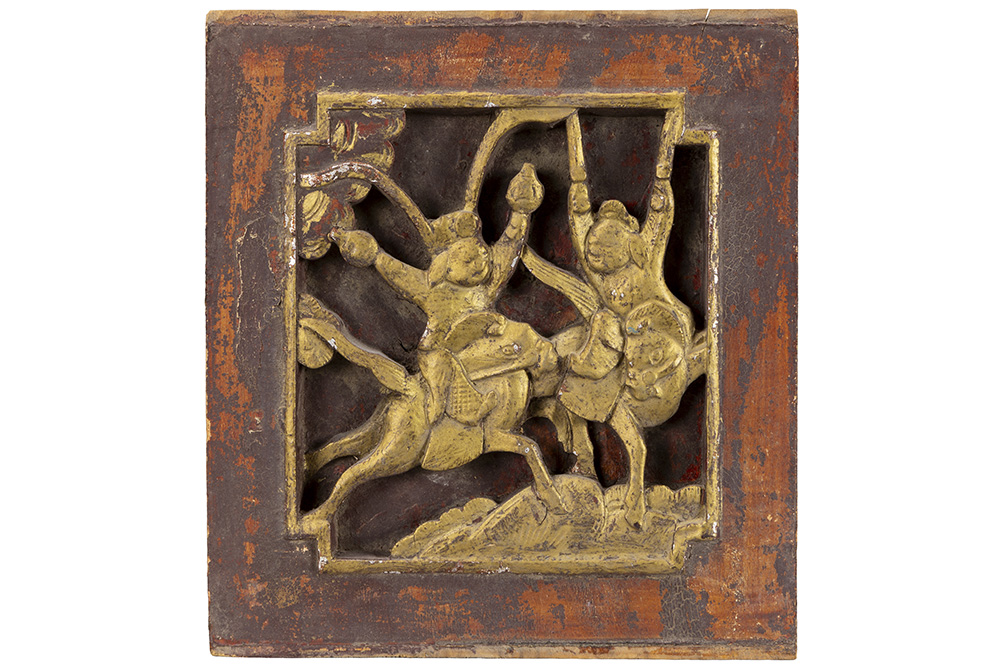 Lot van vier Chinese paneeltjes uit de late Qing-periode in hout telkens met een tafereel met personages – telkens ca 23,8 x 21,5 cm