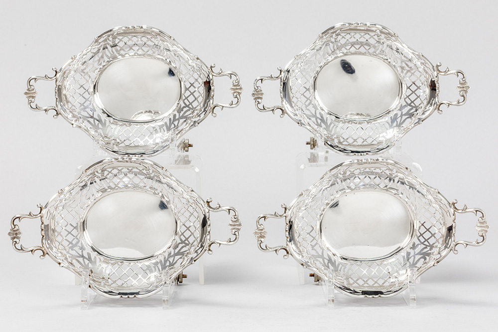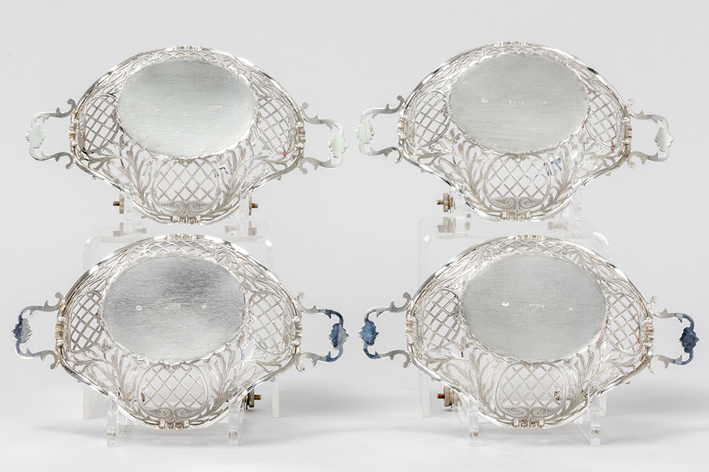 HOEKER & ZOON (Amsterdam) set van vier Nederlandse mandjes met grepen en geajoureerde opstand in massief zilver, gemerkt “2de gehalte” – breedte : 18,7 cm – gewicht : 430 gram getekend
