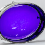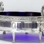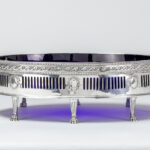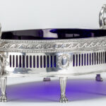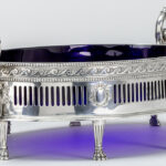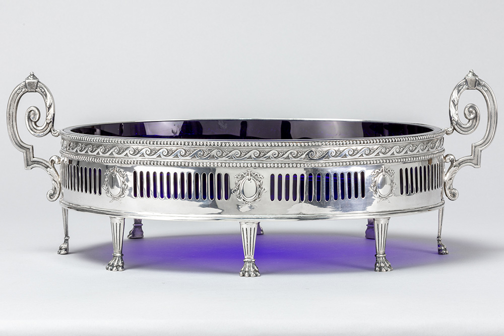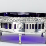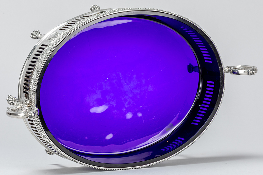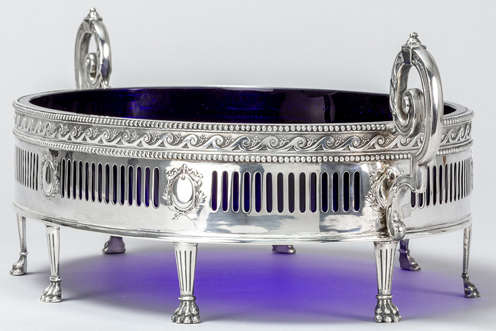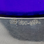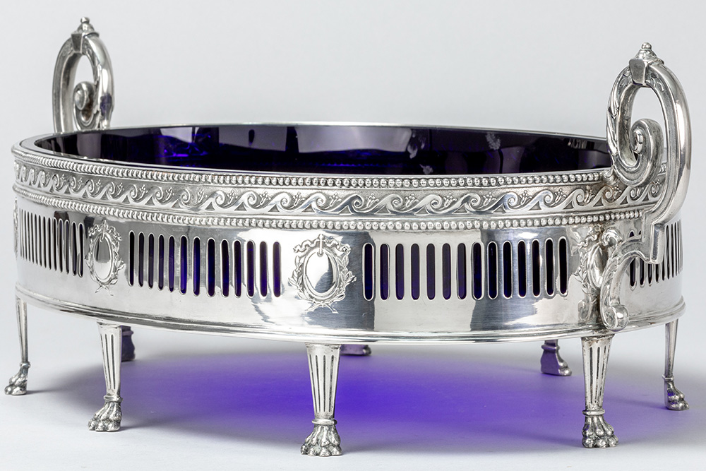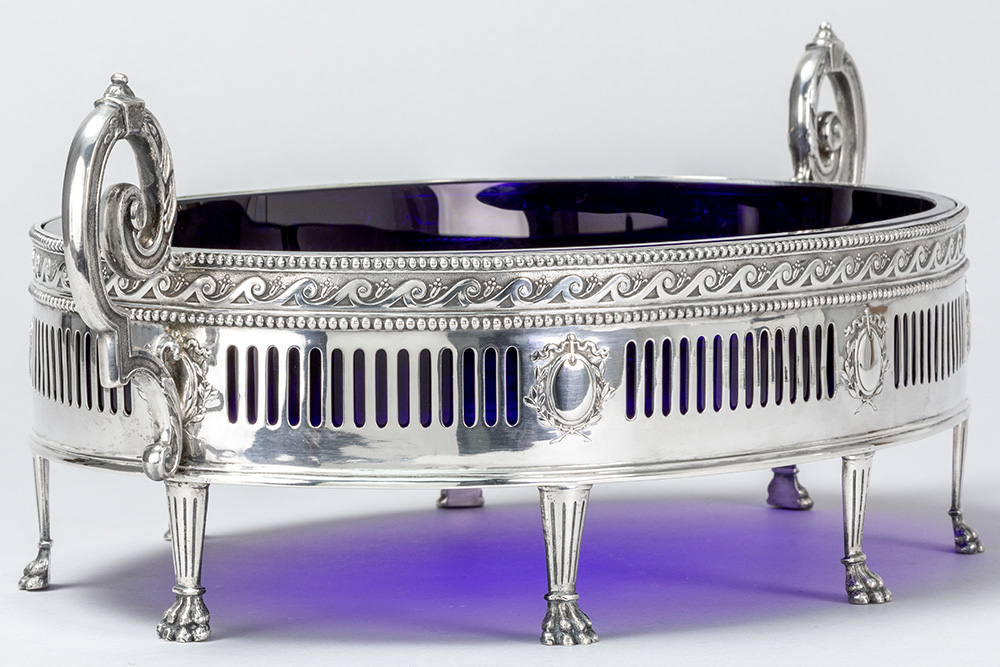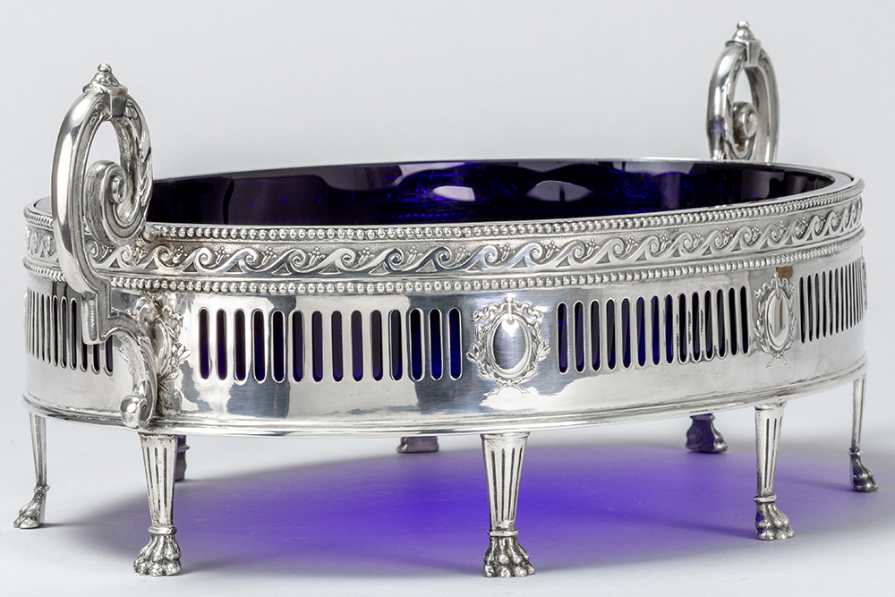 Antieke vrij grote neoclassicistische milieu de table in massief zilver, gemerkt “800”, met typische ornamentiek en met originele liner in blauw kristalglas – breedte : 45 cm – gewicht aan zilver : 884 gram